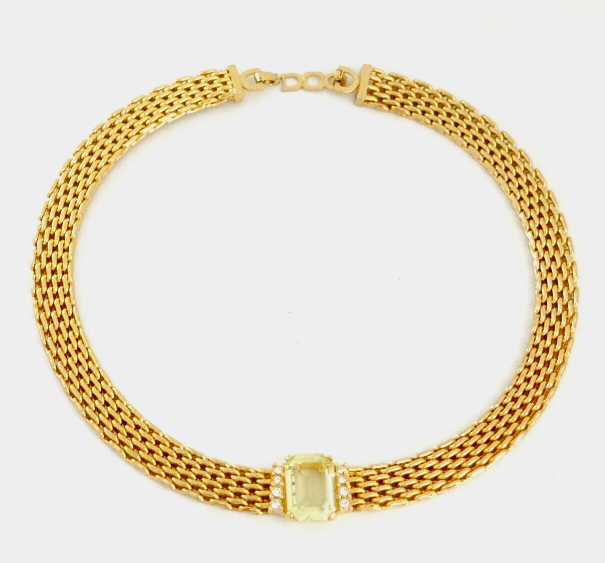 Stunning!! Vintage High End Signed Christian Dior "Chr.Dior" Vintage High End Christian Dior Runway Golden Metal Mesh Yellow Crystal Necklace All In Excellent condition. Approx. measure 16" Long Thank you for looking and considering this item. Using the description, your knowledge and experience with this type of item, any Q&A messaging, along with all of the photos, decide if this item is worthy to purchase for your use or to add to the collection. Please, be aware that the vast majority of my pieces are vintage or antique and consequently NOT IN NEW or MINT CONDITION. Please, Payment is expected within three days from the end of this auction I ask that you message me to let me know that you are still shopping, usually I will open an unpaid item case 3 days after the auctions has ended Free Returns only Before 14 days.
