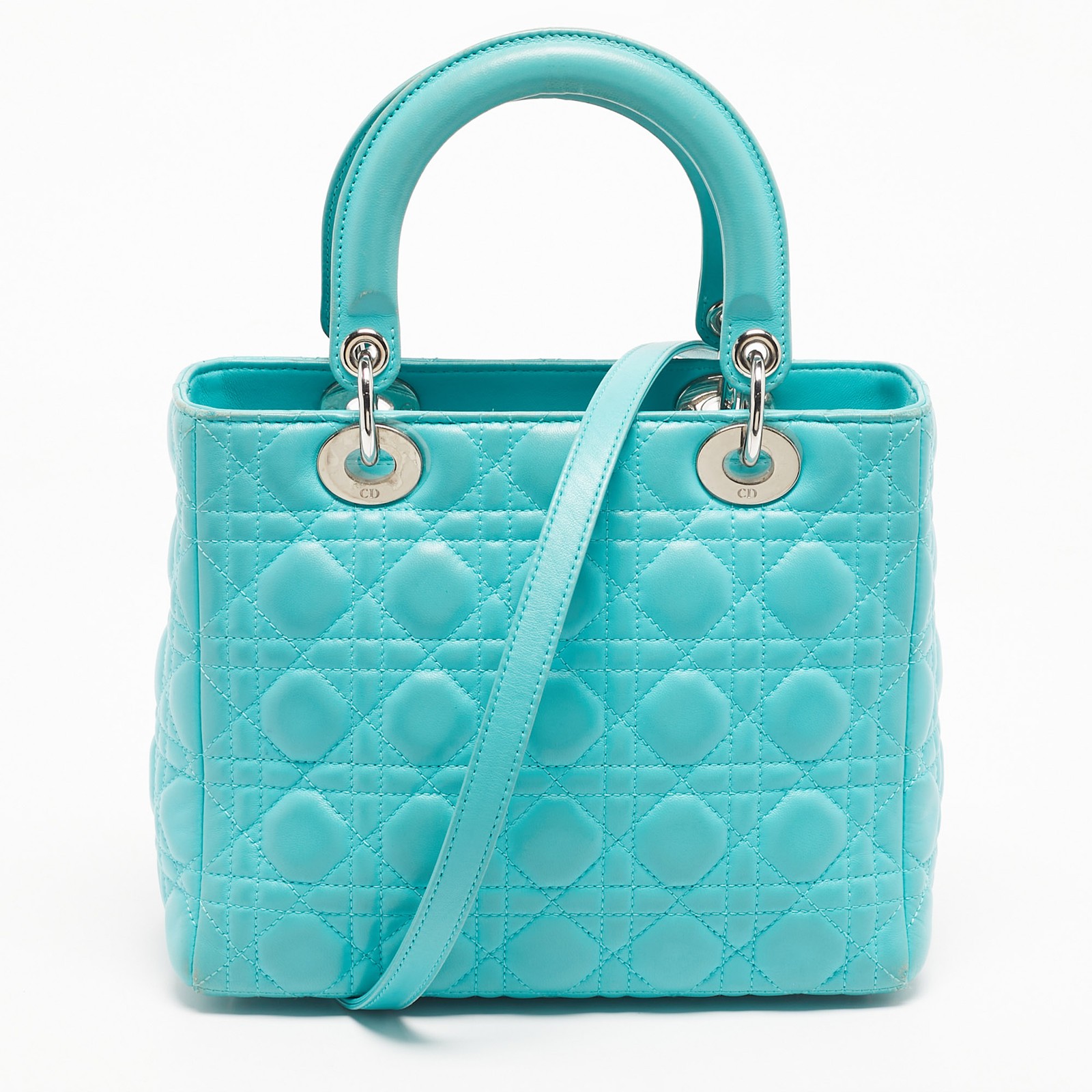 An icon in full color—this Medium Lady Dior tote arrives in vibrant turquoise Cannage stitched leather, a signature of the House. The structured silhouette is finished with silver tone hardware and the instantly recognizable ‘D.I.O.R.’ letter charms that sway gently with movement. A fresh, striking take on a timeless Dior classic.Certified by The Luxury Closet - This item has gone through a detailed authentication process overseen by our experts. We offer a lifetime guarantee of authenticity on all our items. Import duties, taxes and charges are not included in the item price. These charges are the buyers responsibility. Please check with your country’s customs office to determine what these additional cost will be prior to buying. Our eBay Store About Us Contact Us Add to Favorite Sellers Dior Turquoise Cannage Leather Medium Lady Dior Tote $3547.5 An icon in full color—this Medium Lady Dior tote arrives in vibrant turquoise Cannage stitched leather, a signature of the House. The structured silhouette is finished with silver tone hardware and the instantly recognizable ‘D.I.O.R.’ letter charms that sway gently with movement. A fresh, striking take on a timeless Dior classic. Product Details Brand Color Blue Dimensions Material Leather Size Medium Outsole Width Outsole Length Heel Height Includes Certified by The Luxury Closet This item has gone through a detailed authentication process overseen by our experts. We offer a lifetime guarantee of authenticity on all our items. How We Check The in-house team of experts at The Luxury Closet is highly trained to verify the authenticity and the condition of the luxury products. They ensure that only 100% authentic items are put on sale.The evaluation process is unique with its own mix of assessment criteria and differs according to the category. Each item is evaluated based on the following combination of hallmarks, hardware, stitching, symmetry, material, craftsmanship, stamping, codes, hologram stickers, and packaging. Our authenticators also check if the items have been modified or amended (e.g., aftermarket diamonds, replaced batteries, repaired bags, etc.) International Buyers Import duties, taxes and charges are not included in the item price. These charges are the buyers responsibility. Please check with your country’s customs office to determine what these additional cost will be prior to buying.