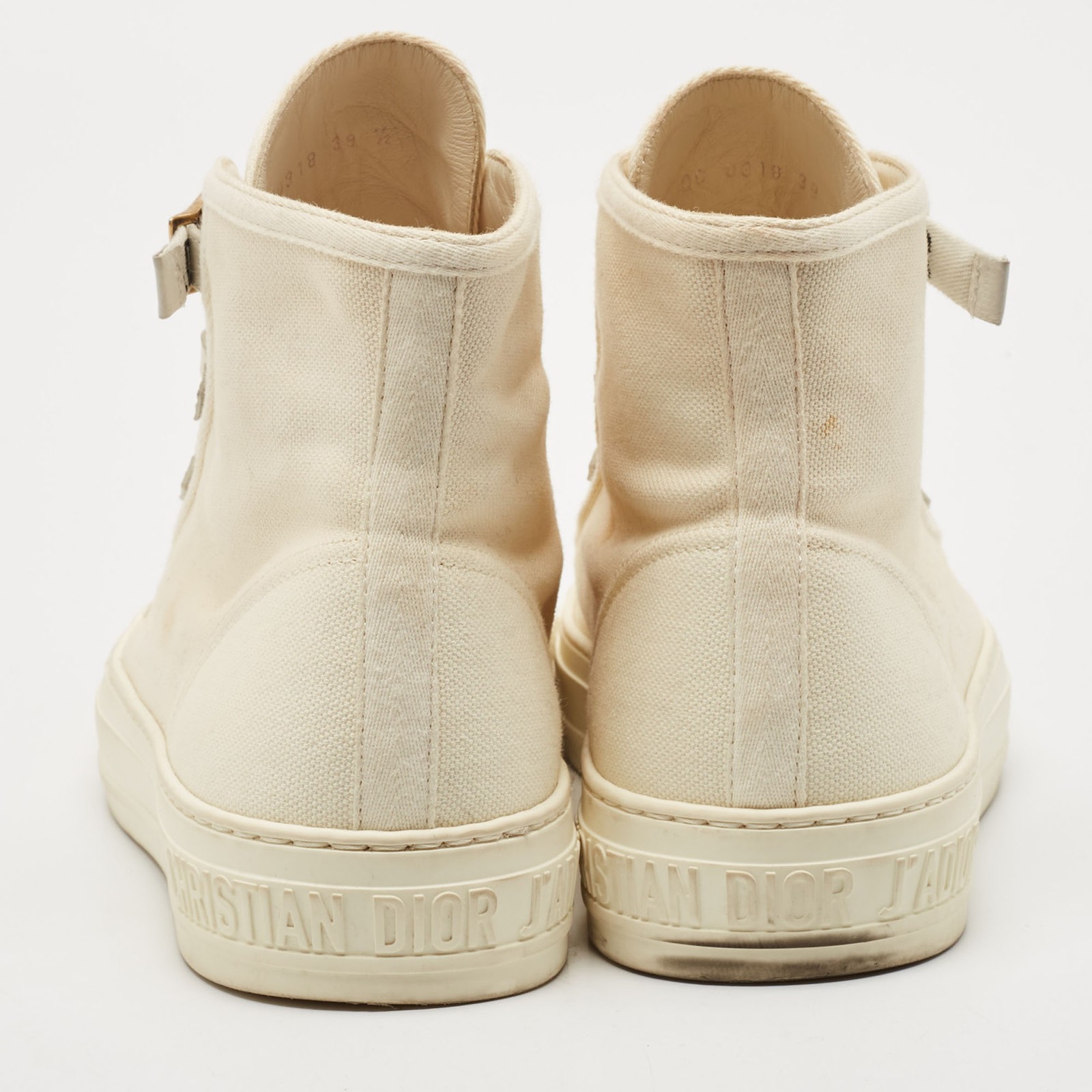 Elevate casual looks with these Dior WalknDior high tops in crisp white canvas. Featuring iconic logo accents and a sleek silhouette, theyre perfect for off duty days or pairing with denim and a cropped blazer for street ready polish. A must have for lovers of luxury with a sporty edge.Certified by The Luxury Closet - This item has gone through a detailed authentication process overseen by our experts. We offer a lifetime guarantee of authenticity on all our items. Import duties, taxes and charges are not included in the item price. These charges are the buyers responsibility. Please check with your country’s customs office to determine what these additional cost will be prior to buying. Our eBay Store About Us Contact Us Add to Favorite Sellers Dior White Canvas Walk'n'Dior High Top Sneakers Size 39.5 $748 Elevate casual looks with these Dior WalknDior high tops in crisp white canvas. Featuring iconic logo accents and a sleek silhouette, theyre perfect for off duty days or pairing with denim and a cropped blazer for street ready polish. A must have for lovers of luxury with a sporty edge. Product Details Brand Color White Dimensions Material Canvas Size 39.5 Outsole Width Outsole Length Heel Height Includes Certified by The Luxury Closet This item has gone through a detailed authentication process overseen by our experts. We offer a lifetime guarantee of authenticity on all our items. How We Check The in-house team of experts at The Luxury Closet is highly trained to verify the authenticity and the condition of the luxury products. They ensure that only 100% authentic items are put on sale.The evaluation process is unique with its own mix of assessment criteria and differs according to the category. Each item is evaluated based on the following combination of hallmarks, hardware, stitching, symmetry, material, craftsmanship, stamping, codes, hologram stickers, and packaging. Our authenticators also check if the items have been modified or amended (e.g., aftermarket diamonds, replaced batteries, repaired bags, etc.) International Buyers Import duties, taxes and charges are not included in the item price. These charges are the buyers responsibility. Please check with your country’s customs office to determine what these additional cost will be prior to buying.