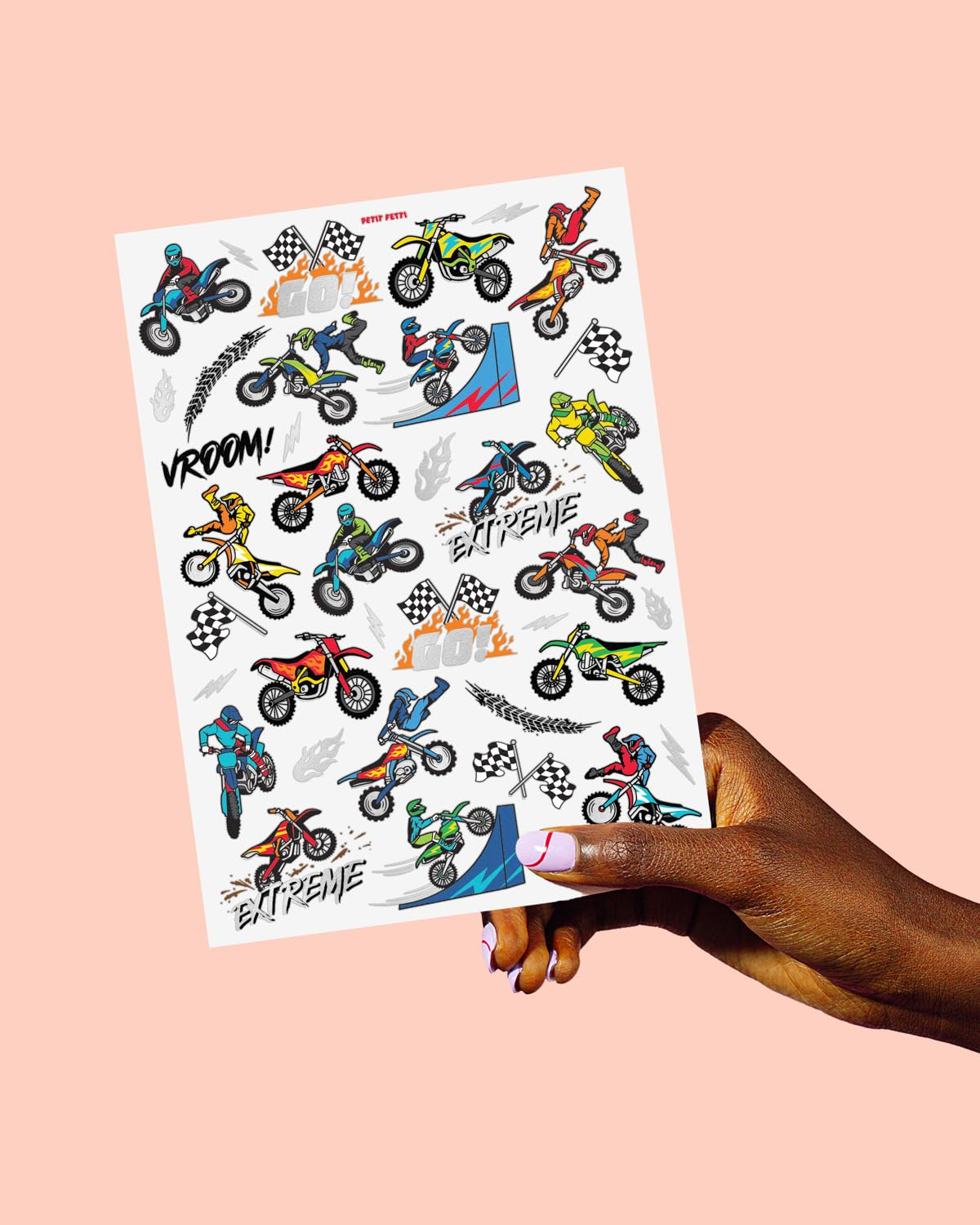 Dirt Bike Temporary Tattoos Party Decorations - 48 Silver Foil | Birthday Party Decorations, Motocross Accessory, Motorcycle Theme Favor, Boys Bicycle Gift + Supplies, Checker Flag Décor Party Must Have: you asked, we delivered - silver foil dirt bike temporary tattoos the perfect accessory or decoration for your party. Includes: two sheets measuring 8.25 " x 6 " each, which includes enough tattoo designs for the whole party! Exclusive Designs: our super unique hand drawn designs are guaranteed to be a party hit. Tat up with hand drawn designs like: flames, dirt bikes, checkered flags + more! Party Strong: these tattoos were made to last long after the party stops. Waterproof, durable, and skin safe - the perfect party accessory. Instructions: choose a design, place face down on clean and dry skin, use a damp paper towel to pat the tattoo, remove the tattoo paper to reveal the cutest tattoo. We also included the steps on the back of each tattoo sheet. Our silver foil dirt bike tattoos are the perfect addition to your motocross party! There are 48 total designs to choose from, all proven to be waterproof, durable and skin safe. Inspired by your dirt bike party, we created exclusive designs of flames, dirt bikes, checkered flags + more that makes for the coolest party favors. With a simple application process, everyone at the party will love these. Want more? We make a whole bunch more party supplies just as cute as these in our storefront! Dimensions 5.94 inches x 8.27 inches x 0.12 inches. Weight: 0.85 oz Specifications Style Motocross/Dirt Bike Color Green Water Resistance Level Waterproof Country of Origin China Pattern Dirt bikes, flames, and checkered flags Package Dimensions 8.27 x 5.94 x 0.12 inches; 0.85 ounces Shipping: Shipped from the USA. Fast delivery within 2–3 days. Payment: PayPal, credit card, bank transfer. Returns: 30-day free return – we cover the shipping cost. Quality: Made in Europe/USA/China. No customs fees. VAT invoice on request. Feedback: You’ll automatically receive positive feedback after payment.