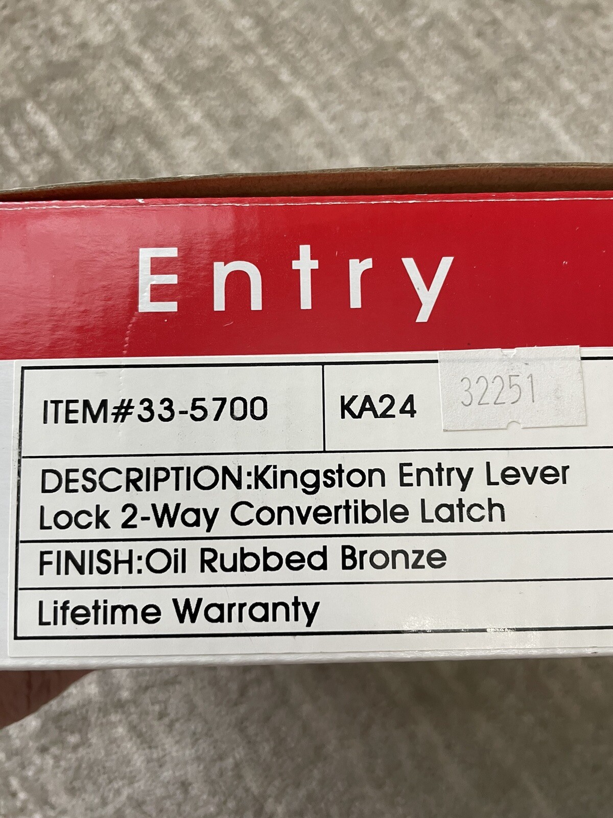 Designers Impressions Kingston Entry Lever Lock 2 Way Convertible Latch. Oil rubbed bronze. Entry (Front & Back) Design: Kingston Finish: Oil Rubbed Bronze Key included Adjustable Latch to fit 2 3/8" and 2 3/4" Backsets Fits on 1 3/8" to 1 3/4" thick doors Includes all Mounting Hardware Matching Strike Plates Included