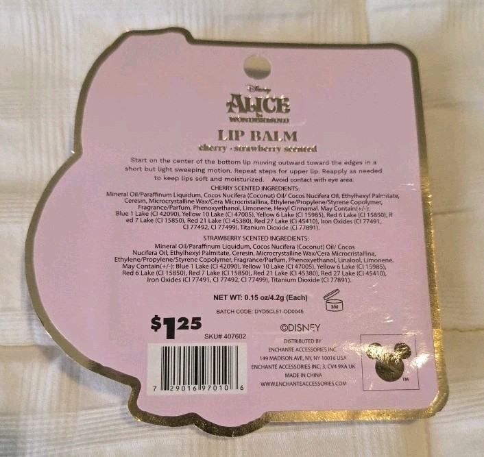 The Disney Alice in Wonderland 2 count Lip Balm set includes two lip balms, with cherry and strawberry scents. These lip balms are formulated with coconut oil to moisturize and heal dry, chapped, or cracked lips, making them suitable for all skin types. The compact size of 0.15 oz each makes them convenient to carry around for on-the-go use, providing a sweet and fruity aroma while protecting your lips from harsh conditions.