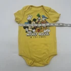The Disney Baby One Piece Toddler Boys Size 6-9M in Yellow with Graphic Print Logo is a comfortable and stylish outfit suitable for a variety of occasions, such as travel, parties, or casual wear. Made from a blend of polyester and cotton, this one-piece features short sleeves, a crew neck, and snap closures for easy dressing. The cartoon and TV character theme, along with the designer look, adds charm to this classic piece, perfect for boys who love Disney. Ideal for summer, fall, and spring seasons, this bodysuit is a must-have for any toddler boy's wardrobe. Check pictures for flaws and measurements
