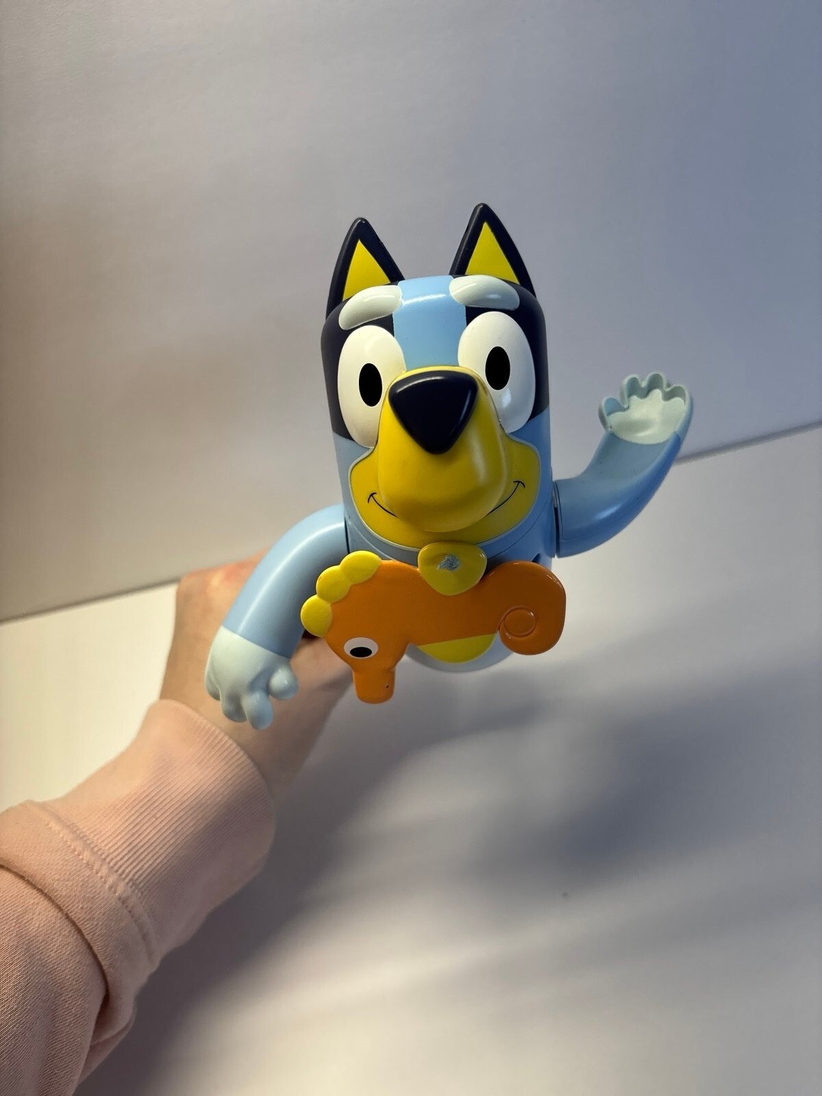 Swimming Bluey, used condition has some minor scuffs and marks but over all good shape. Pull the seahorse attached to a string and set Bluey in the water and let her go she moves forward. Super fun. Perfect for the bath, pool or beach days! No box as is. Bin: D 7 kids/toys