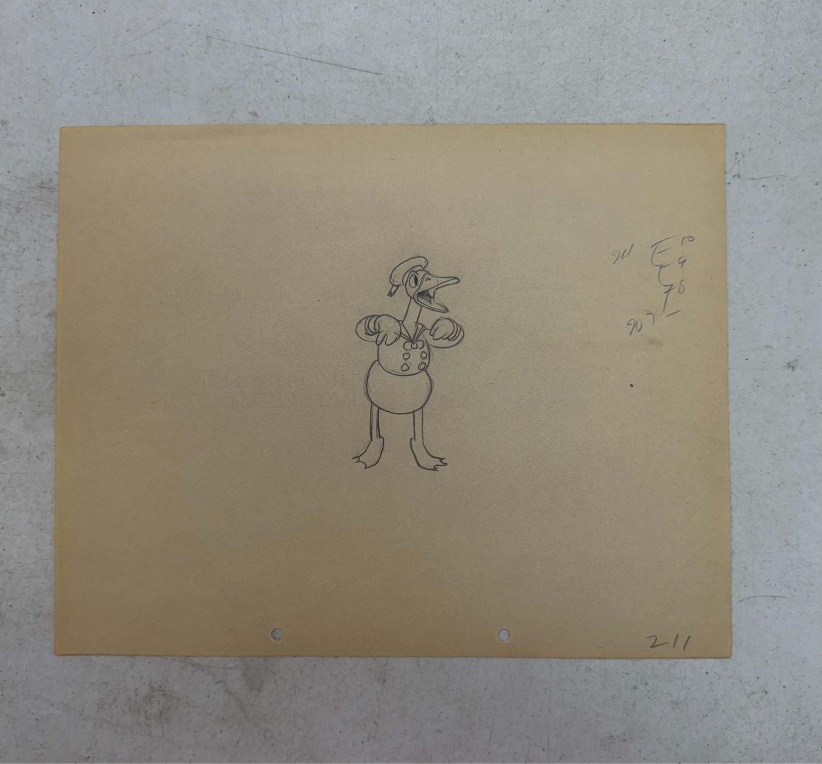 Disney Donald Duck Original Production Drawing from Orphan's Benefit 1934 Reciting Mary had a little lamb 42 seconds in, Donald Duck makes his first appearance in a Mickey Mouse short as the performer of the classic nursery rhyme "Mary had a little lamb" in this historic piece! The Burt Gillett-directed short Orphan's Benefit featured four different performers trying to entertain a theater full of orphan mice with piano, operatic singing, dance, and Donald's few stubborn attempts at reciting a nursery rhyme. The 12 field 2-peghole animation drawing shines a spotlight on the classic, sought-after long-billed Donald Duck after he finally loses his patience. The mice want nothing more than to heckle him, and, after trying and failing again and again, Donald decides to take matters into his own hands. The drawing is full figure and rendered in graphite. Overall page size is 12 x 9.5 and comes unframed