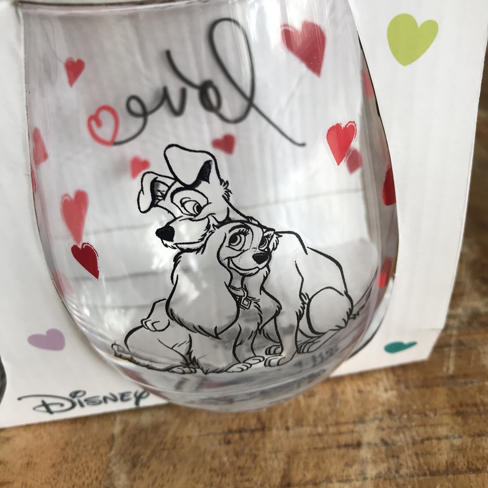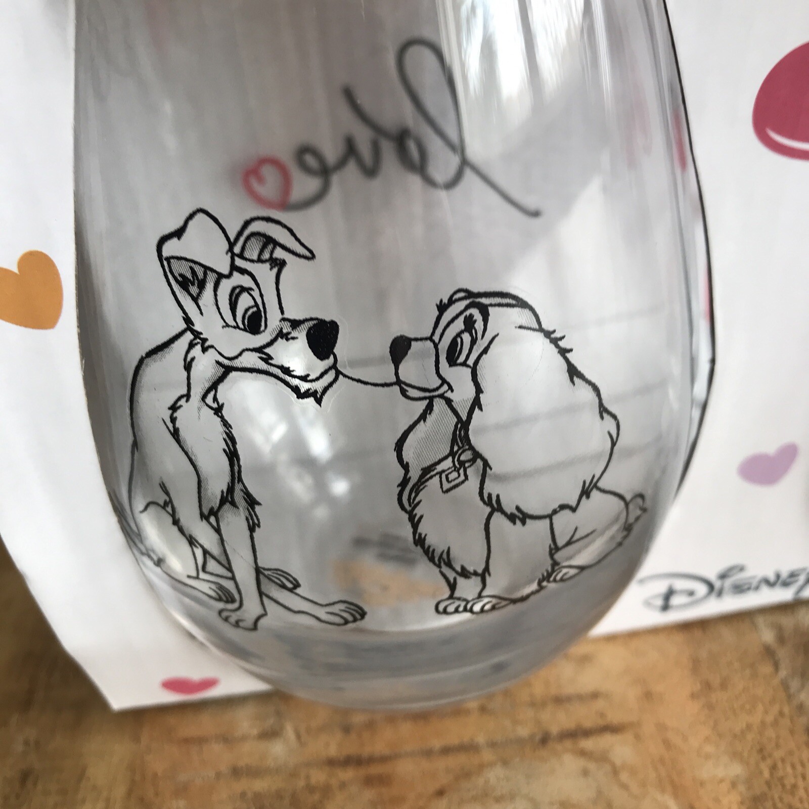 Celebrate Valentine's Day with a touch of Disney magic. This set of two stemless wine glasses features the iconic duo from "Lady and the Tramp," perfect for sharing a romantic toast. Crafted from durable glass and decorated with a charming hearts pattern, these 500 ml glasses are a delightful addition to any table setting. The glasses come complete with a presentation box, making them an ideal gift for Disney fans and collectors alike. Designed with a clear color that showcases the decorations beautifully, this unbranded set is made in China and is sure to be a memorable part of your special occasions.