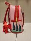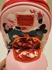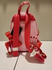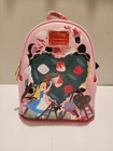 This is a Disney Loungefly Alice In Wonderland mini backpack featuring a "Painting The Roses Red" theme. The backpack is multicolored with red handle/strap, gold hardware, and faux leather exterior. It has applique accents, a zip closure, adjustable straps, and multiple pockets. Ideal for travel, casual, formal, or business occasions, the backpack is detailed with a cartoon and movie theme, perfect for fans of Alice in Wonderland.