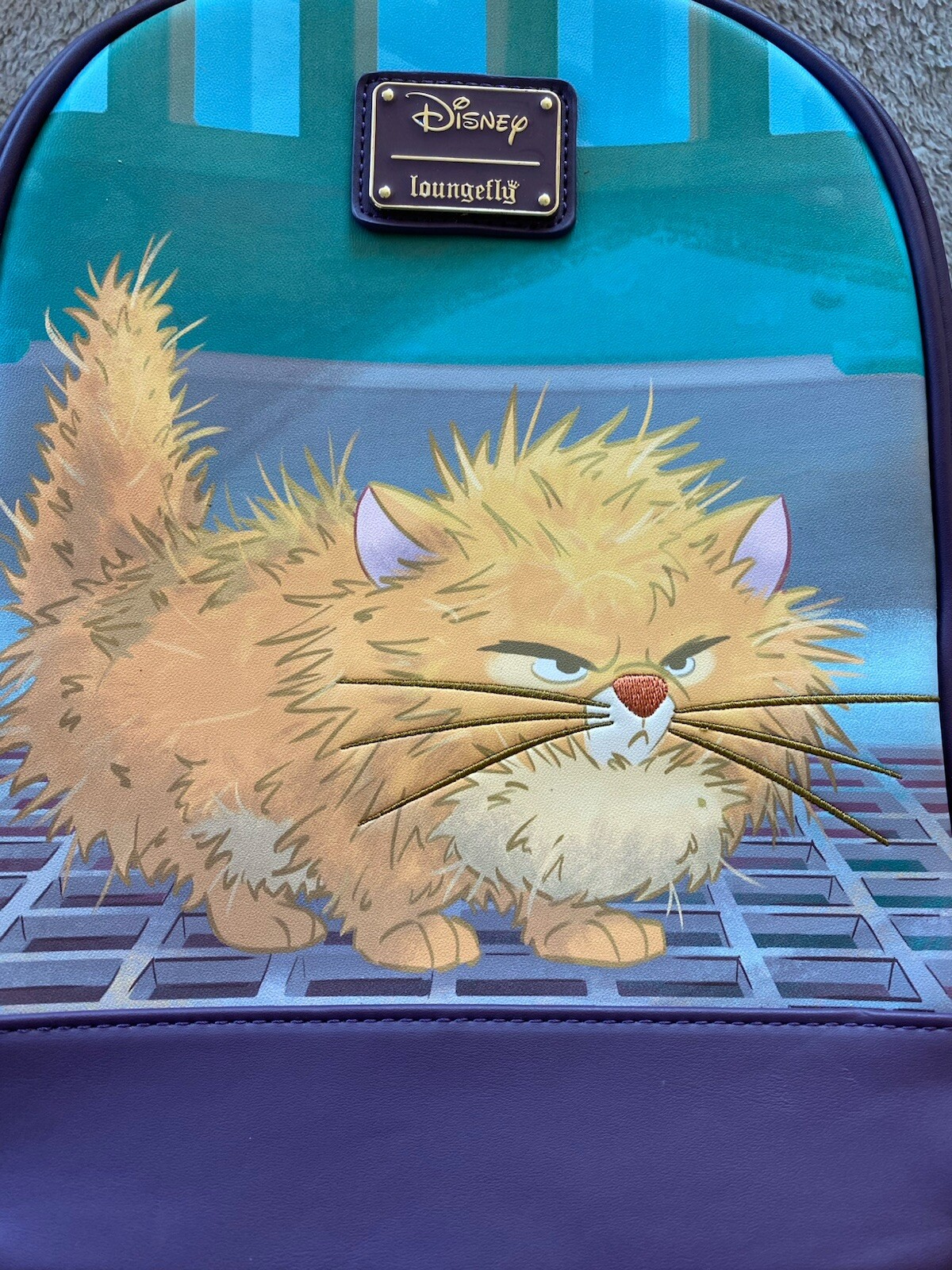 Loungefly Disney Oliver & Company Street Grate Mini Backpack - BoxLunch Exclusive. Backpack is gently used and in nice condition. Was very gently used only a handful of times. Dress with true street savoir faire whenever you rock this Disney mini backpack from Loungefly! This bag features a front graphic of the scene in Oliver & Company where Oliver walks over a street grate and fluffs up his fur. With two side pockets, gold-toned hardware, an enamel brand badge, adjustable shoulder straps, and an outline portrait interior lining pattern, this backpack is perfect for cruising through the city and beyond! A BoxLunch Exclusive! Polyurethane; polyester lining Approx. 9" W x 12" H x 4 1/2" D Imported JJ