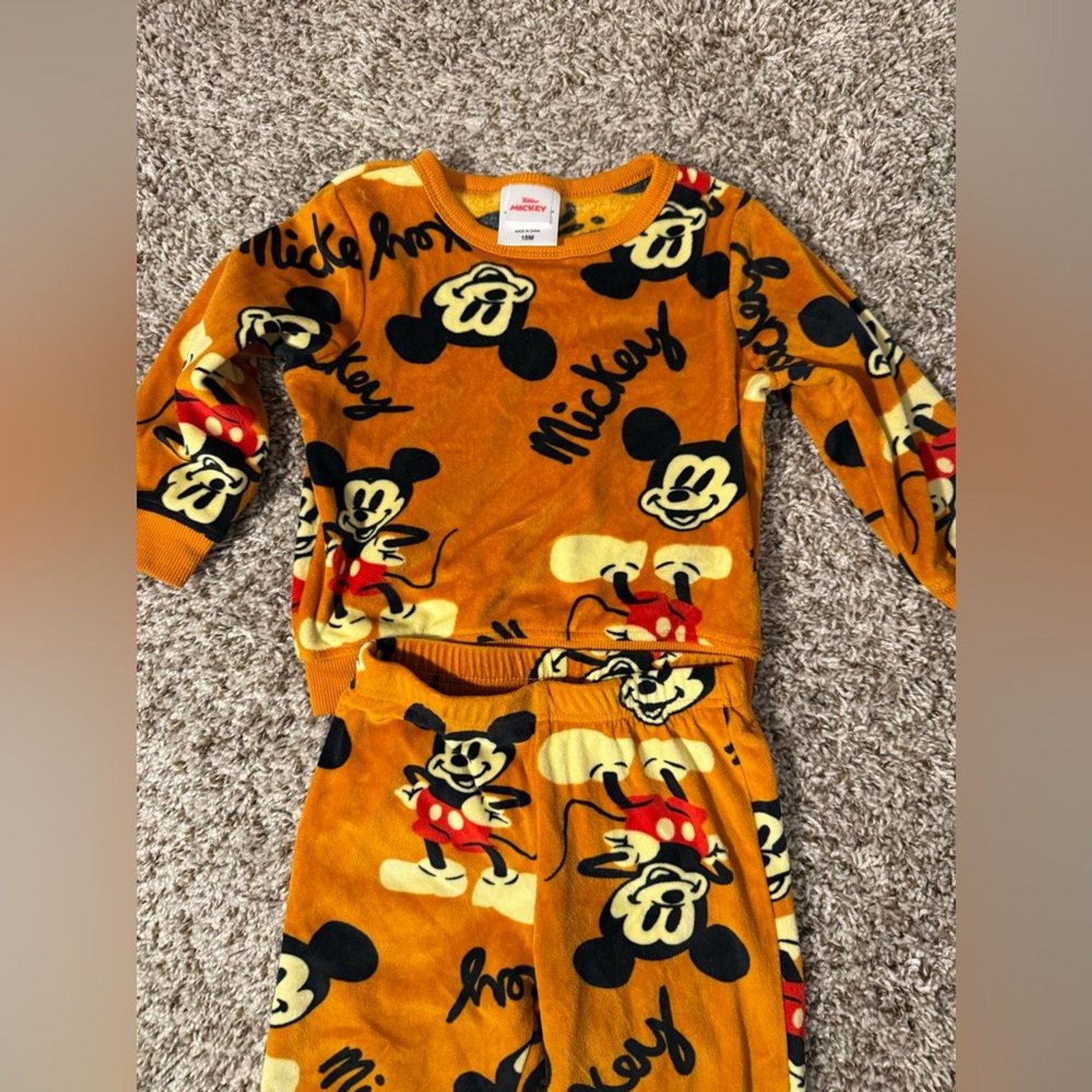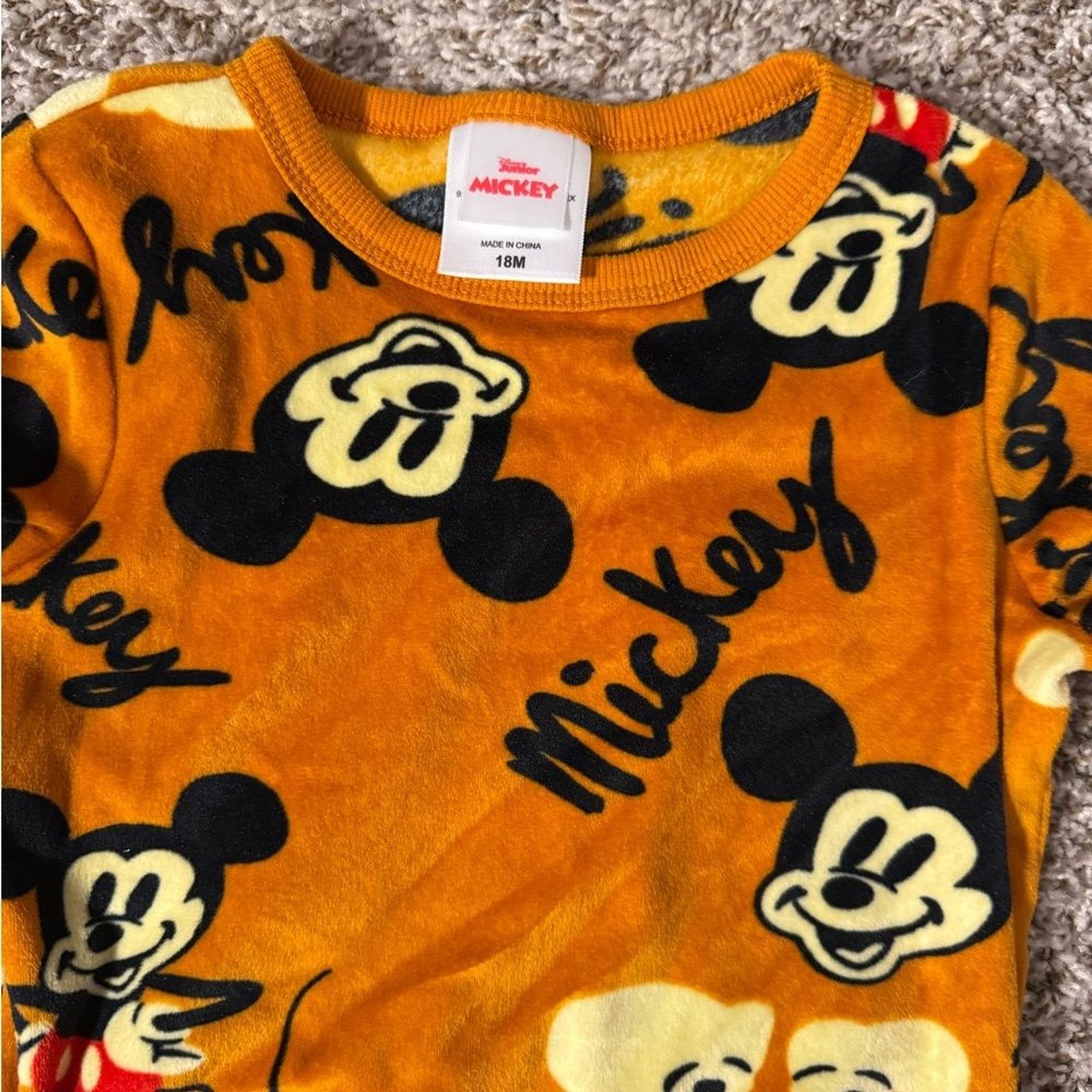 Disney Mickey Mouse fleece outfit set in size 18M. Includes a fleece long-sleeve top and matching pants with bold Mickey graphics. Cozy, cute, and ideal for cooler weather. Gently worn and in great condition. Ships fast — usually within 24 hours.