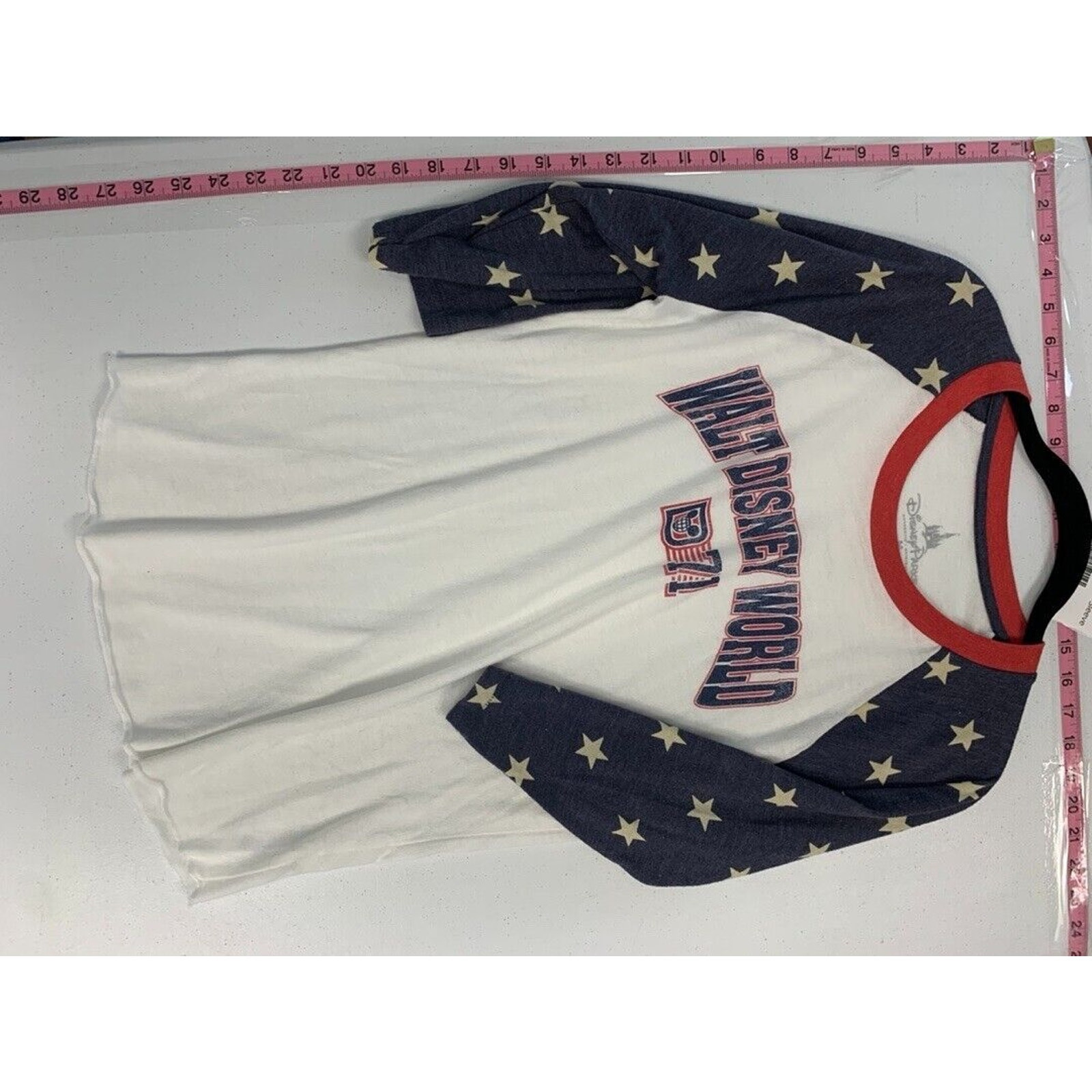 This classic raglan tee features a retro "Walt Disney World '71" print and star-patterned sleeves, offering a stylish and nostalgic look. • 3/4-length star-patterned sleeves • Red contrast neckline • Lightweight, breathable fabric • Official Disney Parks merchandise • Relaxed fit design Top to bottom = 26 inches, pit to pit = 17 inches