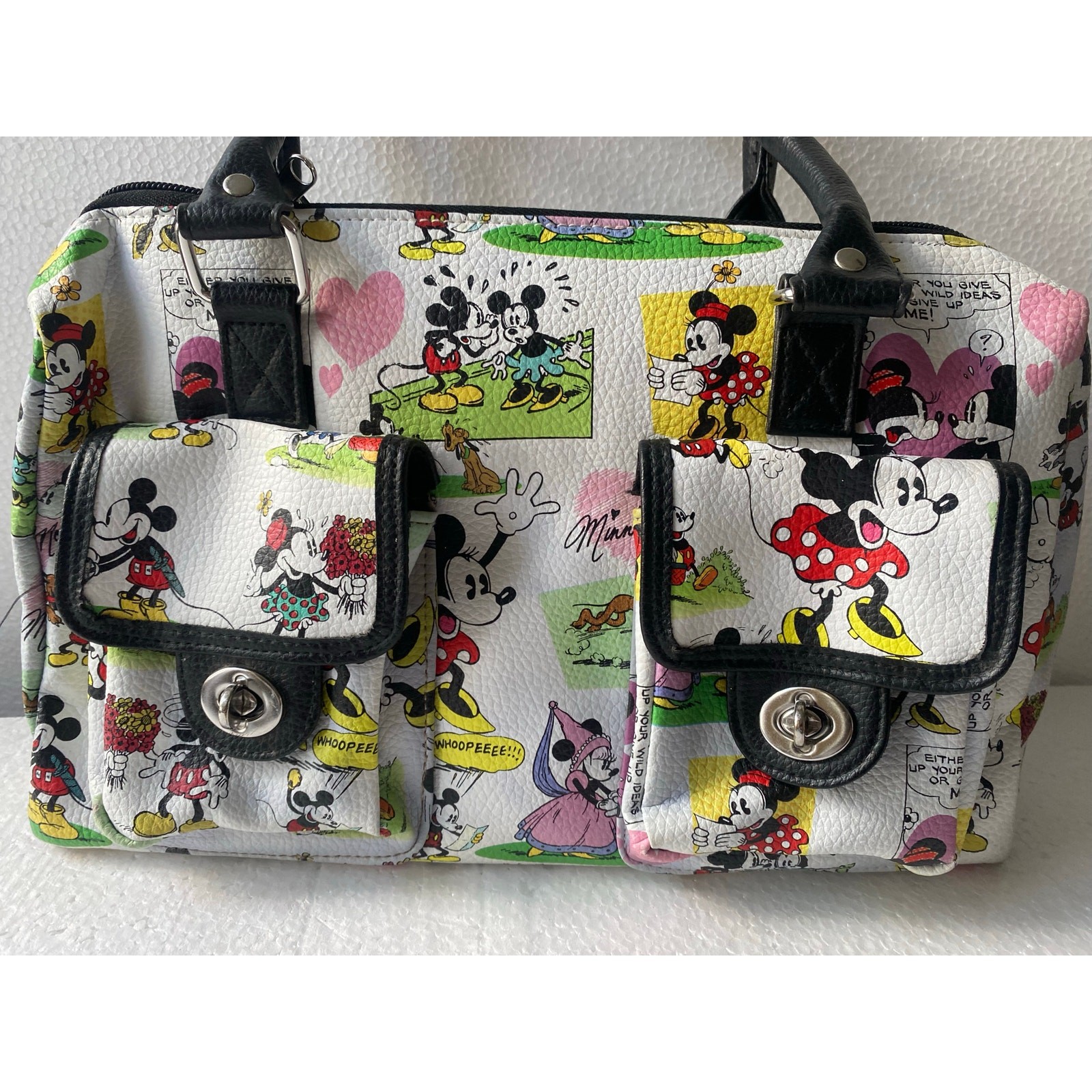 Disney Parks authentic Mickey and Minnie Mouse cartoon collage satchel handbag pre owned in Good condición