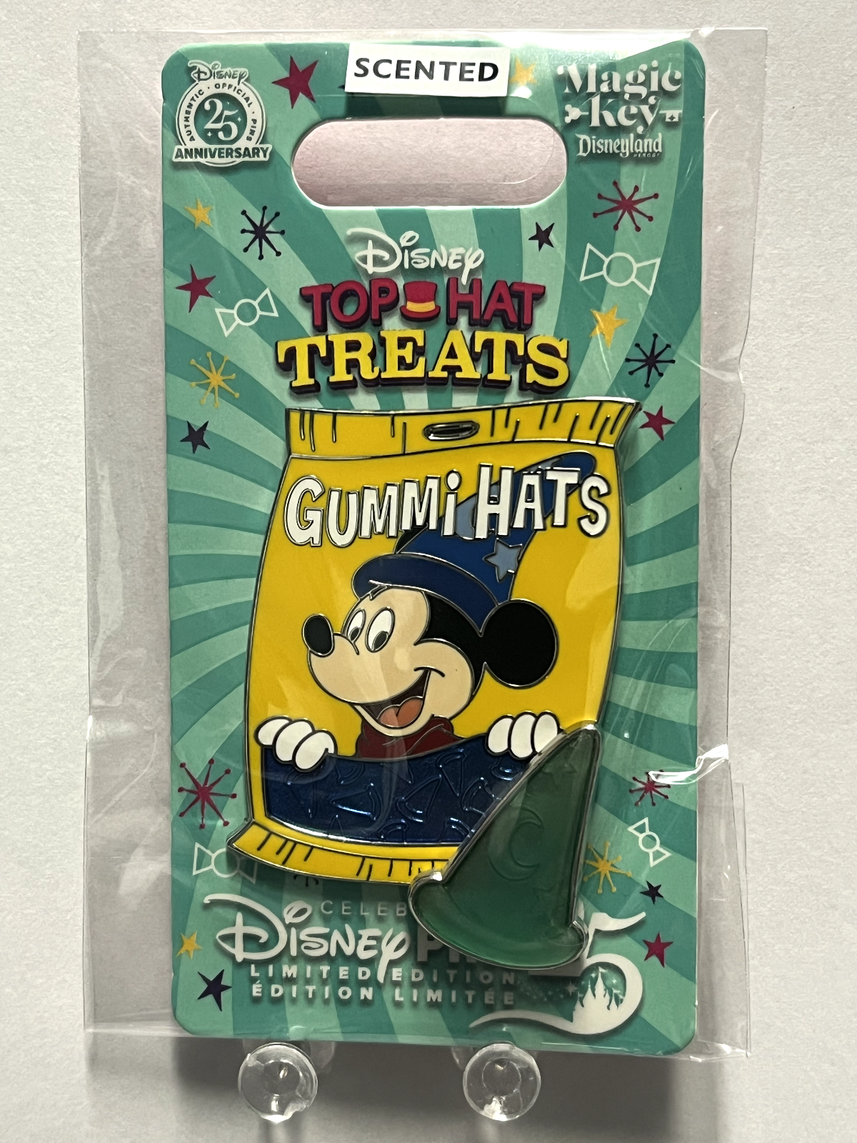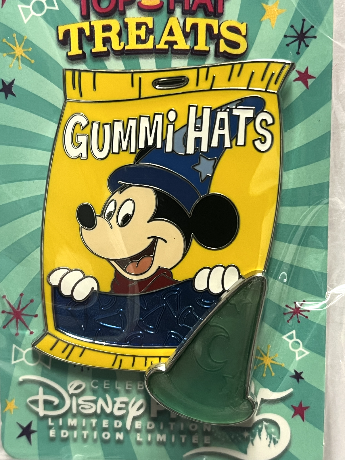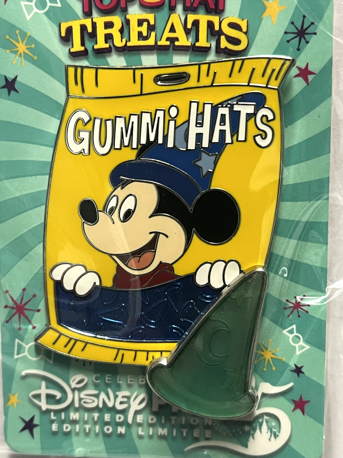 One of four TOP HAT TREATS quarterly pins released at DL in 2025 as Magic Key exclusives. Each GUMMI BAG pin features a different Disney character on the front of a candy bag. In the bottom-right corner of the pin, one of the candy pieces (pin-on-pin element) is sitting in front of the bag. The backer card has the "Celebrating 25 Years of Disney Pins" logo on it. This is the first pin of the series, released in January 2025, and it features GUMMI HATS with SORCERER MICKEY on the front of the bag. The candy piece looks like Mickey's blue sorcerer's hat. Characters in this series include Mickey, Donald, Minnie and Goofy. Thanks to pin pics for the description. Combined shipping discount is: Full shipping cost for the 1st pin and then add $0.50 for each additional pin paid for in a single transaction. If you purchase multiple items, please wait for an invoice with the adjusted shipping cost before checking out. Feel free to ping me and let me know to send you an invoice. Thanks!