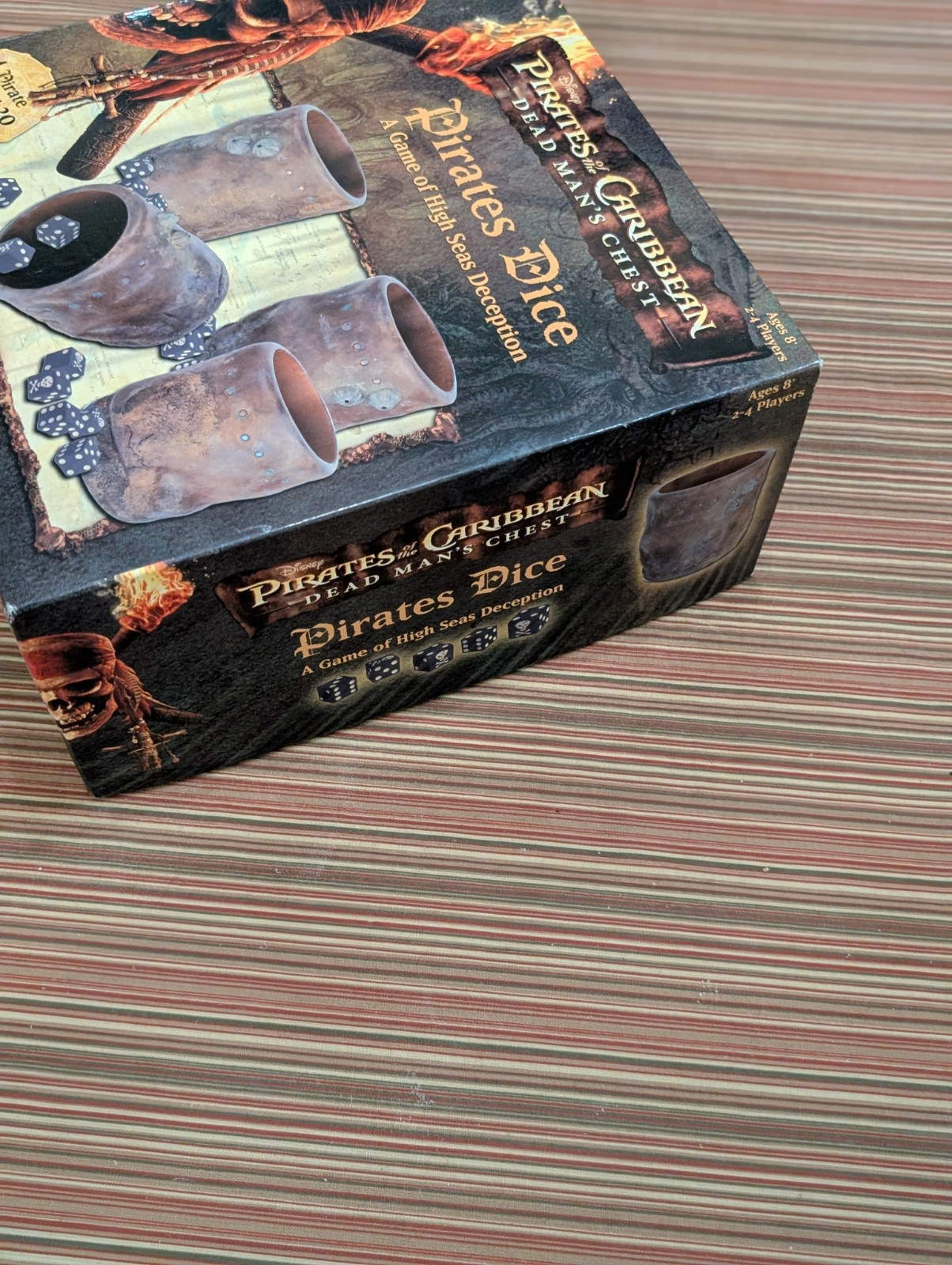 The Disney Pirates of the Caribbean At World's End Pirates Dice Game is a brown plastic dice game featuring characters from the Pirates of the Caribbean franchise. Manufactured in 2006, this 100% complete game includes dice and is designed for ages 8 and up. It is part of the Pirates Dice series, with a theme inspired by TV, movie, and video games. The game is branded by Disney and received the Games 100 award.