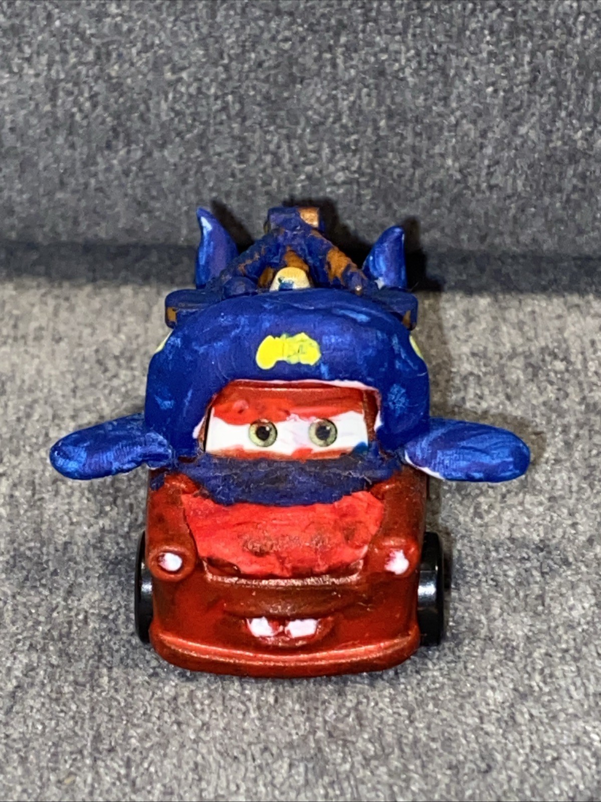 This hand-painted custom Air Mater Mini Racer is a fine addition for your Pixar Cars Mini Racers collection. This is the only known Air Mater Cars Toon Mini Racer. This custom was made using a Tow Mater model and painted to match the Mater persona as seen in the short of the same name. This custom was made by me about 5 years ago. The only major call-outs are rough thick painting, paint scratches, and marks.
