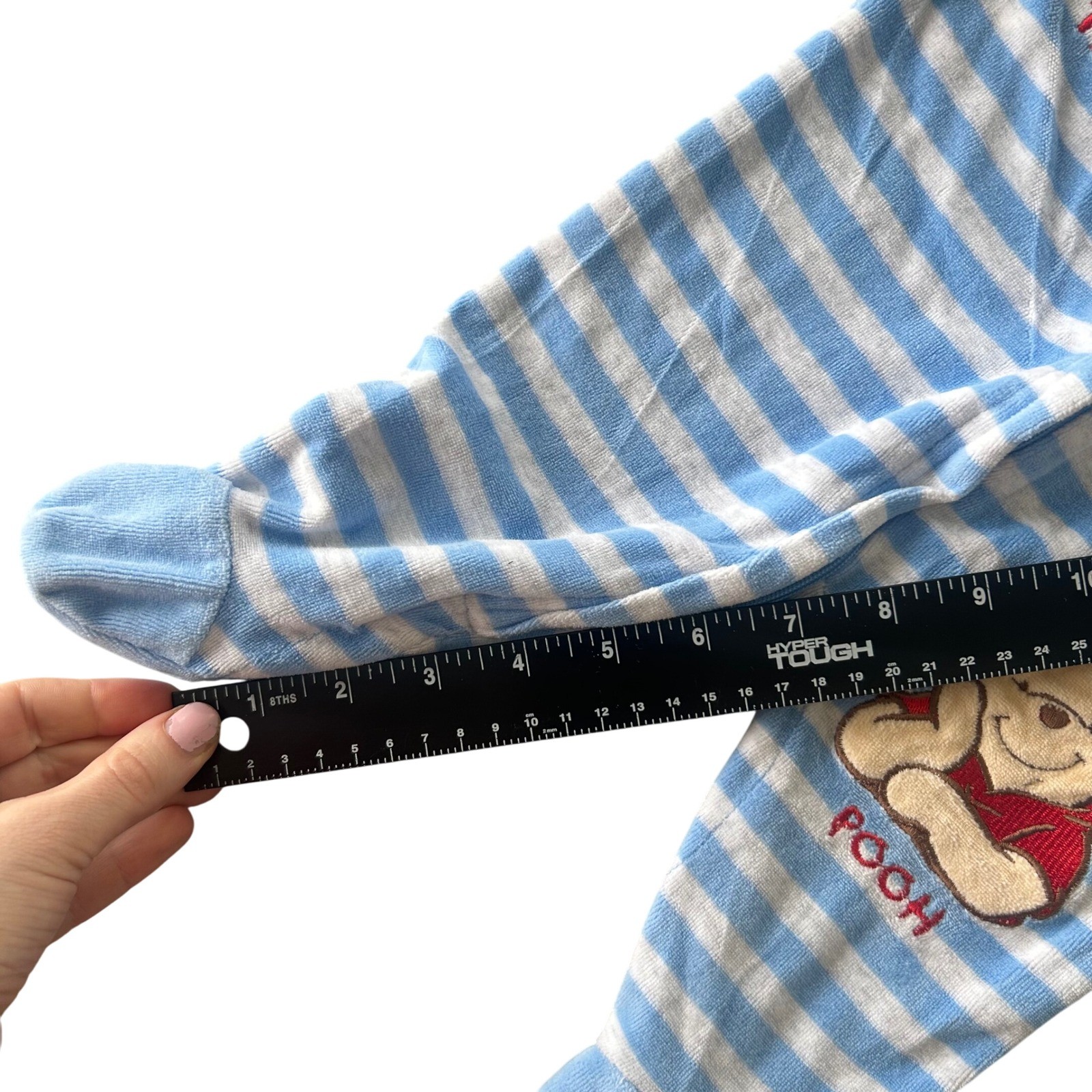 Snuggle up in whimsical comfort with this adorable Disney Pooh and Tigger fleece footed pajama set. The classic blue and white stripes create a timeless look, while the beloved characters bring a touch of playful magic. Perfect for cozy nights and sweet dreams, this sleepsuit ensures your little one stays warm and happy. Ideal for bedtime, lounging at home, or even as a cute outfit for a baby's first photos. Measurements: • Sleeve Length: 10 in • Inseam: 11 in • Length (Shoulder to Heel): 24 in Department: Unisex Baby & Toddler Type: One Piece Theme: Bear Character Family: Winnie the Pooh Character: Winnie the Pooh, Tigger Material: Polyester Fabric Type: Fleece Closure: Zip Style: Footie Pajamas Pattern: Striped Season: Fall, Winter Number of Pieces: 1 Piece Accents: Embroidered Sleeve Length: Long Sleeve Keywords: Disney, Pooh, Tigger, footed pajamas, sleepsuit, baby, infant, fleece, striped, character, sleepwear, nightwear, baby shower gift All items come from a smoke free, pet friendly home.