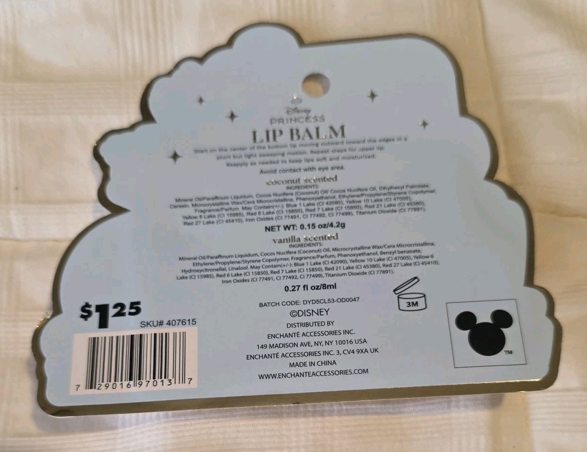 The Disney Princess Cinderella Lip Balm Set includes two lip balms in new packaging, with flavors of coconut and vanilla. These balms are designed to moisturize and hydrate chapped lips, suitable for all skin types. Made with mineral oil as the active ingredient, the set is animal cruelty-free and contains minerals for added nourishment, perfect for both men and women to use.