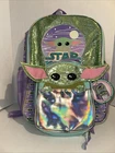 Get your hands on this amazing Disney Star Wars Mandalorian Baby Yoda Backpack With Lunch Bag in Green. The backpack is made of 100% polyester and features a zip closure. It is a large size, measuring 12 inches in width, 18 inches in height, and 4 inches in depth. The backpack is adorned with sequins and has a stars theme, making it perfect for any Star Wars fan. The unisex backpack is perfect for kids, and the backpack is brand new.