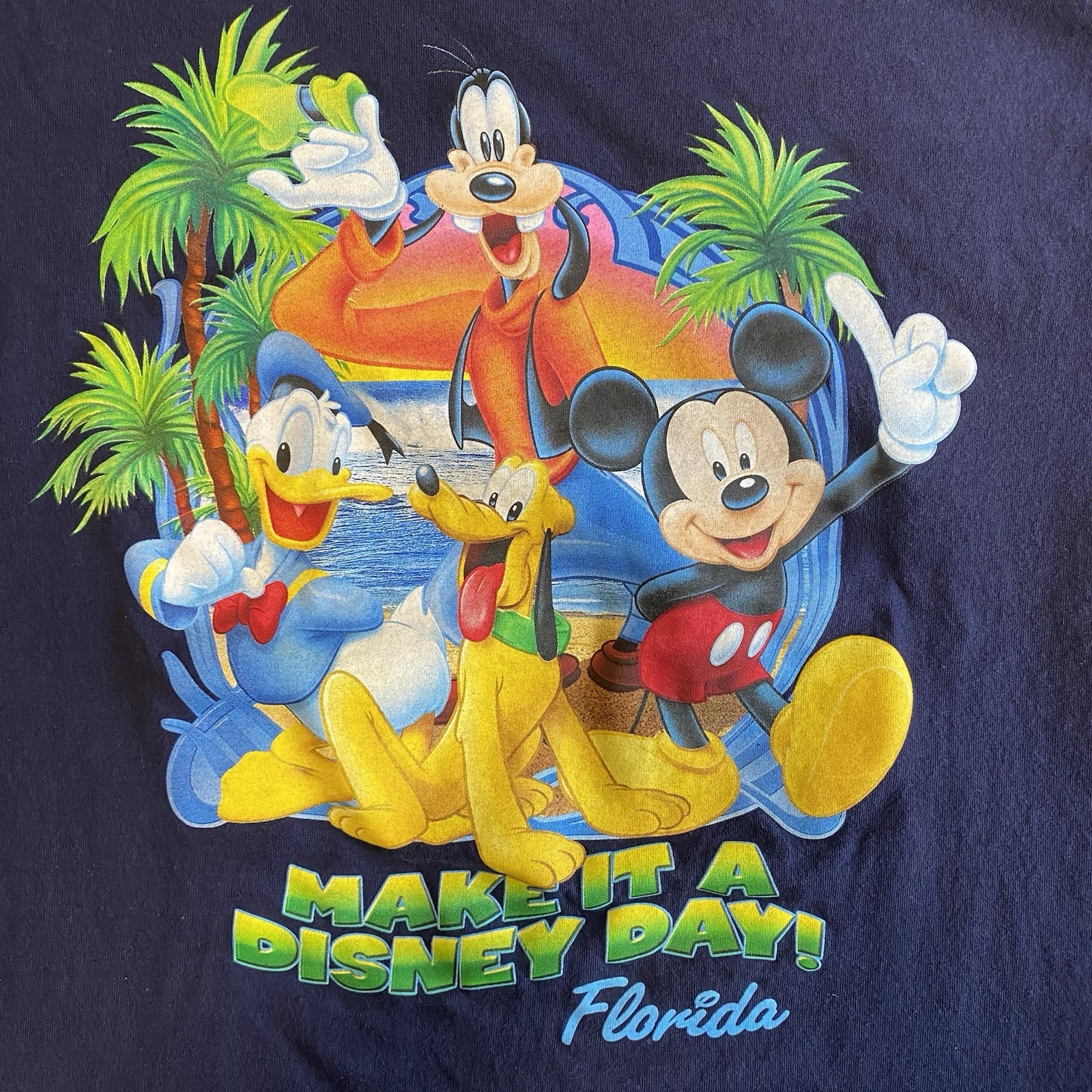 Size medium Disney adult medium Make it a Disney Day Florida short sleeve t-shirt, features Mickey Mouse, Donald Duck, Goofy, Pluto, great for a Disney vacation, preshrunk 100% cotton Pit to pit: 19” Length: 25.5” All items come from a smoke free, pet friendly home. Once the item is out of my possession I cannot guarantee it will not be exposed to smoke. Items that have been washed may have been exposed to scented laundry detergents so please be aware. Thank you!