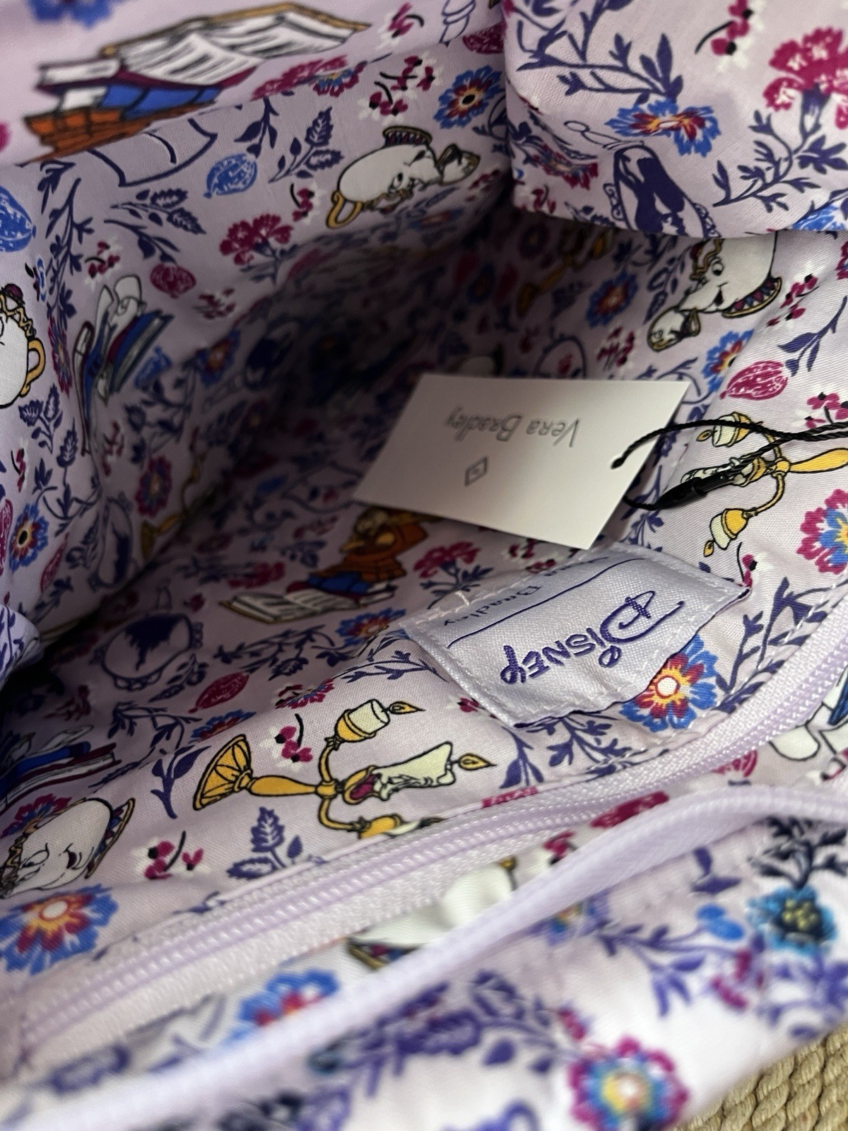 This Disney Vera Bradley Triple Zip Hipster Crossbody Bag is a must-have for any fan of the Beauty and the Beast franchise. The bag features a beautiful lilac exterior color with a quilted finish and silver hardware accents. The adjustable cotton crossbody strap and zip closure make this medium-sized bag perfect for travel and casual occasions.