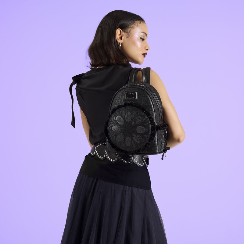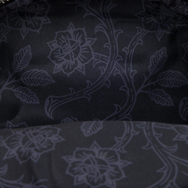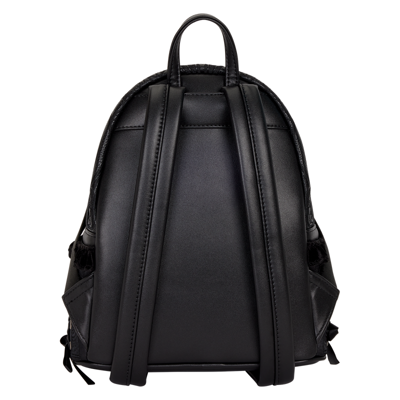 Go ahead, get a little villainous with this mini backpack! This bag pays homage to your favorite Disney Villains. You'll find velvet and shimmer embroidery details on it. On the front pocket, you'll find the portraits of some popular Disney Villains, like Maleficent, Scar, and Hades. Real ribbon details on the side pockets elevate the look. Show off your love for the Disney Villains with this elegant mini backpack! Features Faux leather (polyurethane) mini backpack with velvet trim Sturdy top handle Adjustable shoulder straps Applique, embroidered, real ribbon, velvet ruffle, and printed details Coordinating interior lining Dimensions: 9"W x 10.5"H x 4.5"D 22.8cm W x 26.6cm H x 11.4cm D This is an officially licensed Disney product.