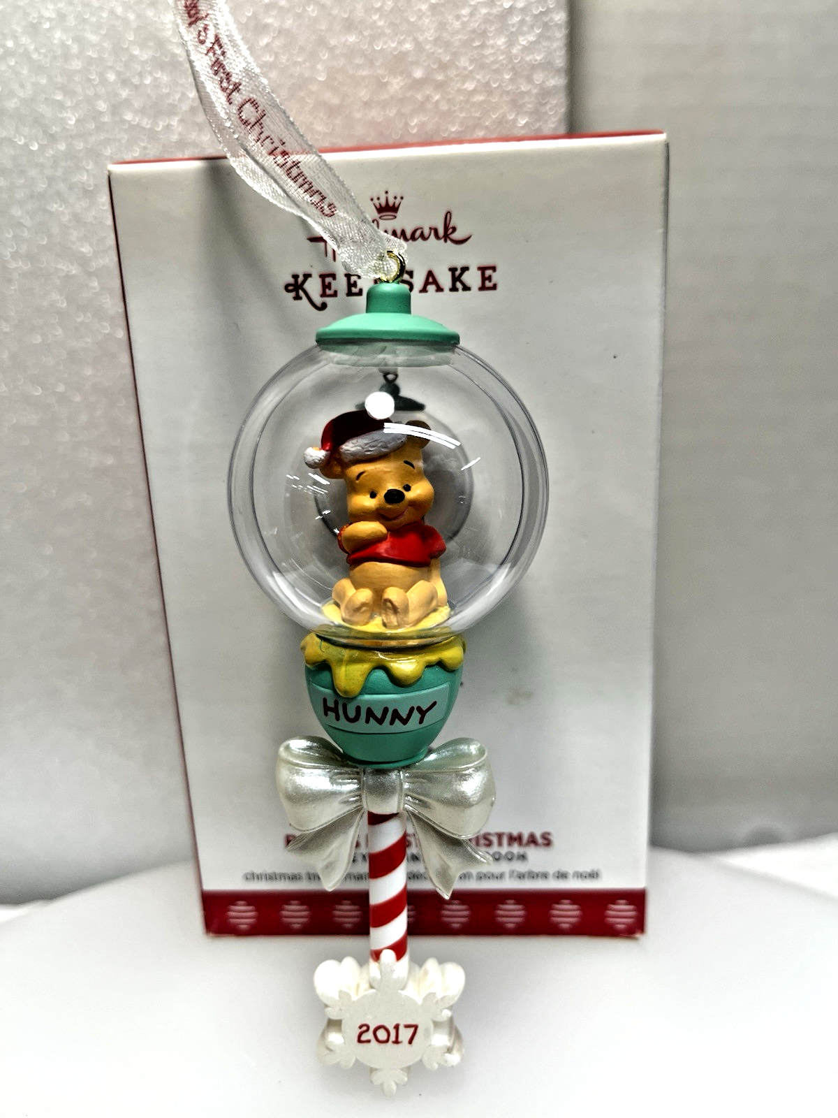 Hallmark Baby's First Christmas Disney Winnie the Pooh Hunny Rattle Ornament New Hallmark Artist, Nina Aube, handcrafted this ornament in 2017. It features a Baby Rattle with Winnie the Pooh in the "globe" of the ornament. He is sitting on his "Hunny" pot,(perfect to welcome a new little "Hunny). The ribbon hanger says "Baby's First Christmas" and the Snowflake handle is dated 2017. Condition is Brand New, Never Displayed. Box Condition is Very Good. (This ornament is from new "Carryover" stock from a now closed Hallmark Gold Crown Store.) * See ITEM SPECIFICS in the listing above, as well as photos of this actual ornament and the ornament box. Ships USPS Ground Advantage