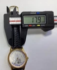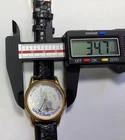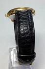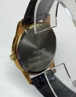 The Disney World 25th Anniversary Watch is a gold tone wristwatch with a black faux leather band, featuring a quartz movement and a buckle closure. This unisex adults' watch has a round shape with a 12-hour dial and seconds hand, making it suitable for casual and classic styles. The watch does not come with a warranty, papers, original box, or manual, but it does have a snap caseback and analog display. Perfect for fans of Disney and collectors of special edition timepieces. 1672