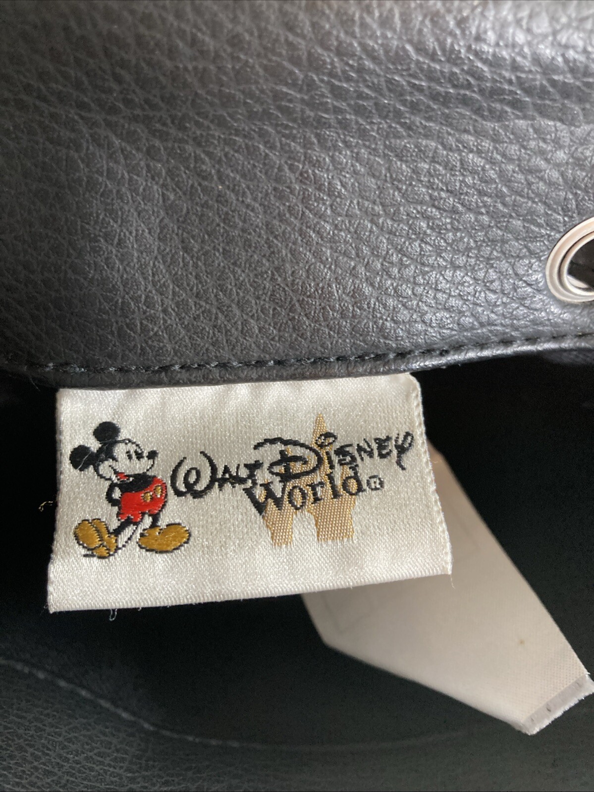 This Disney World Mickey Mouse backpack is made of black pebbled PVC faux leather with Mickey Mouse patches embroidered on it. The drawstring closure and shoulder strap make it easy to carry, while the medium size and adjustable strap provide functionality. The backpack features a cotton lining, silver hardware, and pockets for organization, adding a touch of vintage charm with a fun and classic Disney theme. Perfect for women who love a bohemian or 90s style with a touch of nostalgia.