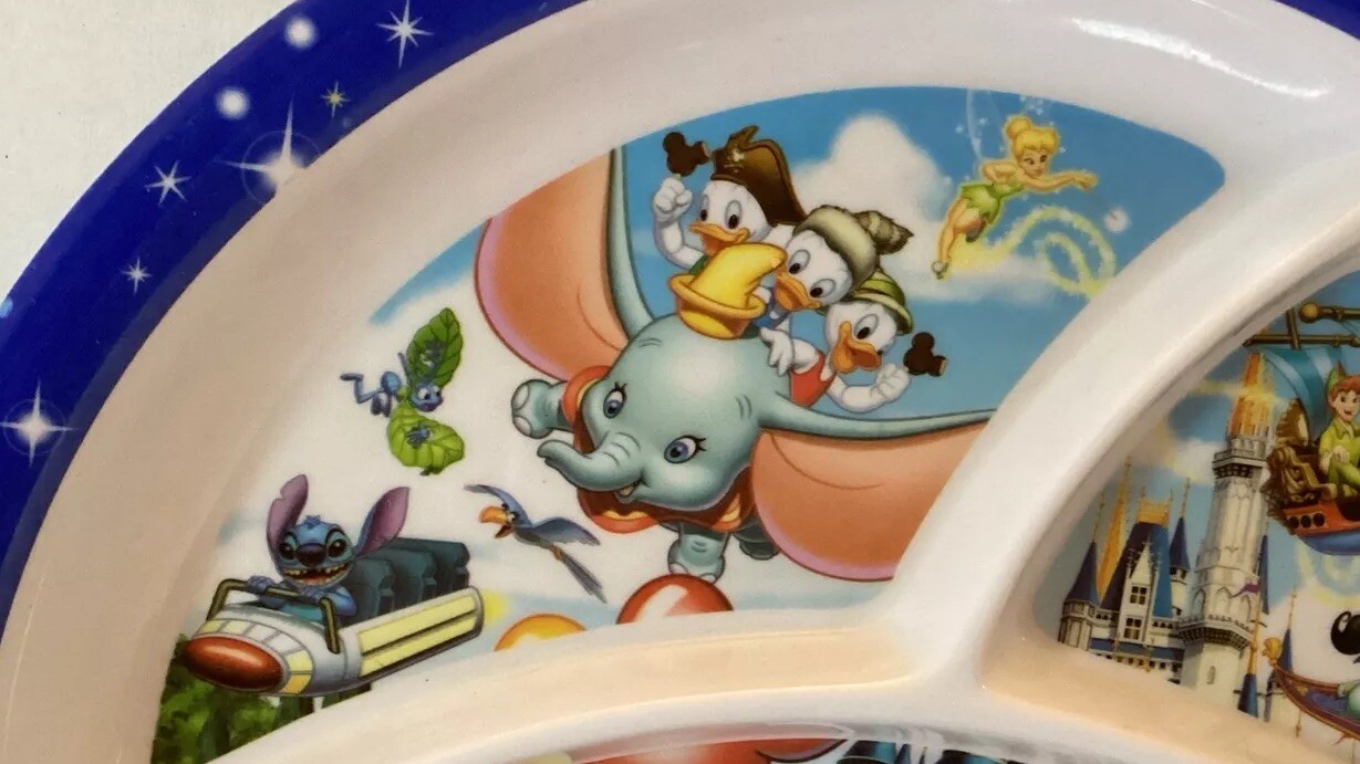 This product is a souvenir divided plate featuring Mickey Mouse and Dumbo, sold at Walt Disney World parks. The plate is 10 inches in size and was manufactured in China. It is a part of the Disney franchise and is categorized as a Disneyana collectible.