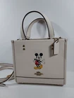 100% authentic Coach Chalk Multi Leather Disney X Coach Dempsey Tote 22 With Mickey Mouse NEW WITH TAGS Chalk Multi/Gold Hardware Refined calf leather Inside zip and multifunction pockets Snap closure, fabric lining Handles with 4 1/4" drop Detachable strap with 22 1/2" drop for shoulder or crossbody wear Four protective feet at base 8 3/4" (L) x 7 3/4" (H) x 4 1/4" (W) Disney x Coach