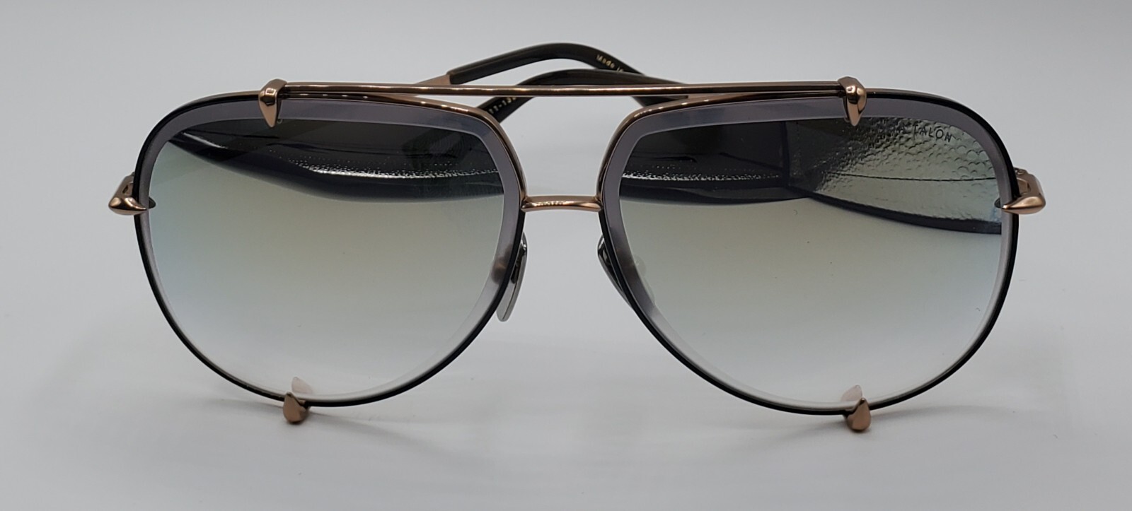 These Dita Sunglasses in the Talon (23007-F-RGD-62-Z) model feature a stylish Aviator design with a rose gold titanium frame and gray gradient flash lenses. The lens technology includes gradient and mirror features. Made in Japan, these unisex sunglasses also showcase a rose-themed aesthetic with a sleek and modern appeal. The sunglasses come with plastic lenses and have a temple length of 135 mm.
