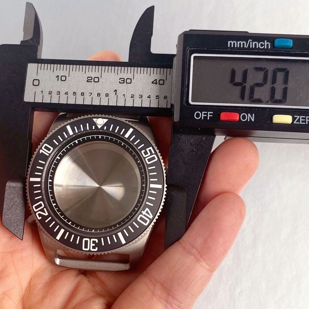 Description: --- Movement: 24 jewels Japan NH34 NH35 NH36 NH38 NH70 NH71 NH72 ETA2824 PT5000 4R35 4R36 7S26 Automatic (self-winding) Movement. --- Crown: 3 o'clock screw in crown --- Case Size:42mm without crown --- Lug to Lug size : 50.5mm --- Case Thickness:13.3mm thickness --- Fit Dial : 27mm-29.3mm Dial --- Case Material: Titanium --- Watch Back Material: Steel --- Chapter Ring Material: Steel --- Glass: Sapphire Crystal Glass --- Watch Back:Steel Back --- Water Resistance: 200m waterproof --- Lug Width:22mm --- Screw-down crown --- Bezel Insert:39.8mm*31.7mm