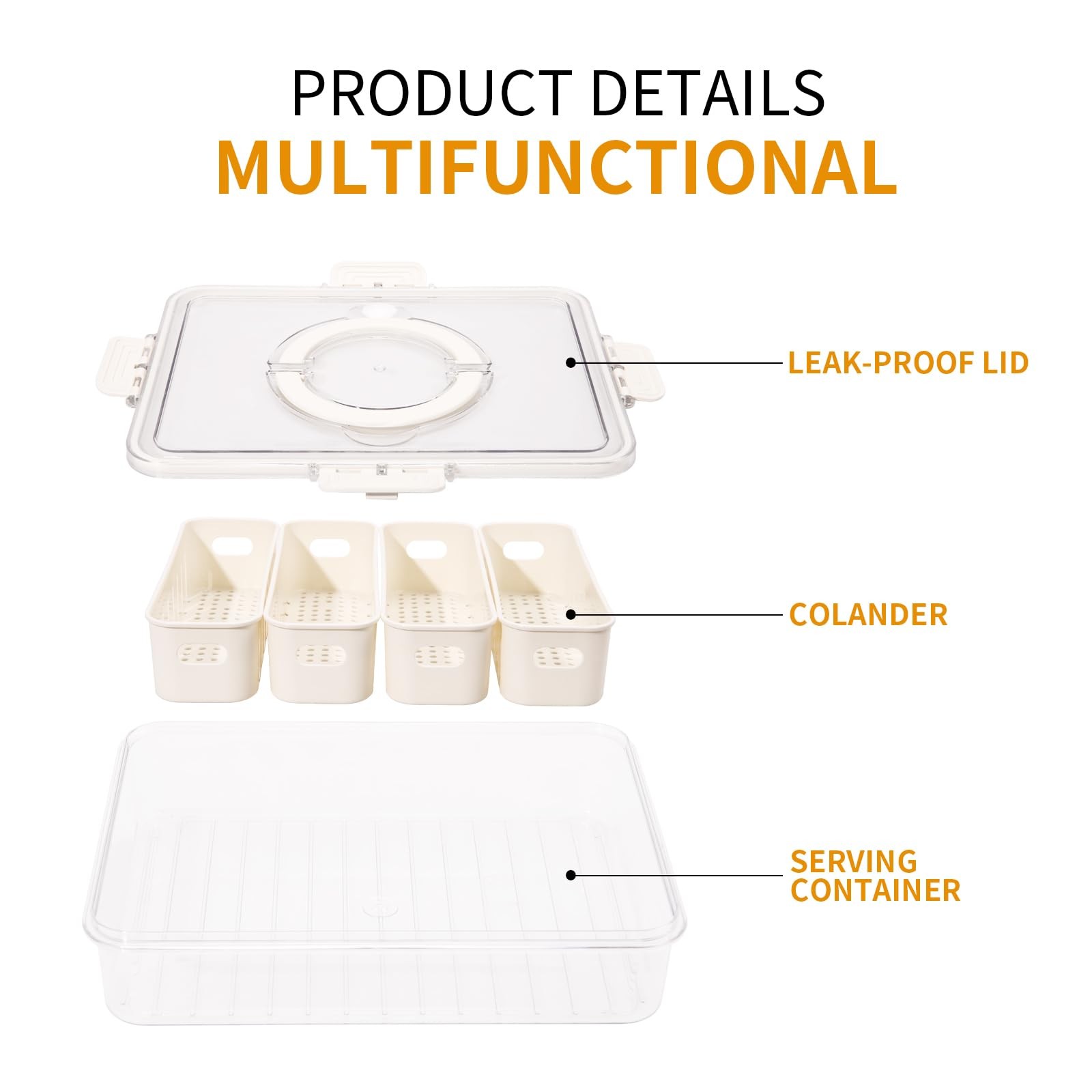 The product is a divided serving tray with lids, handle, and 4 removable colanders, serving as a portable and practical snack box for kitchen organization and storage with features like efficient drainage, multi-compartment design, convenient handle, but not suitable for microwave or dishwasher use. Portable and Practical: The snack box measures 12.2*9.4*2.8 inch. It has ample space for candies, fruits, nuts, fitting in a fridge. Its compact design allows easy carrying in a backpack or picnic basket, ensuring snacks are accessible on the go Efficient Drainage System: The serving tray is designed with a remarkable draining function. This allows for any excess liquid or moisture to be effectively removed, ensuring that snacks stay dry and crisp, maintaining their optimal texture and taste Thoughtful Multi-Compartment Design: With multiple compartments, this snackle box offers excellent organization. It enables users to separate different types of snacks, preventing them from getting mixed up and making it convenient to access Convenient Handle Design: The handle on the meal prep container is a practical addition. It makes it effortless to carry the box around, whether it's for taking snacks on the go or simply for moving it from one place to another at home Usage Tips: Please note that it is not suitable for use in a microwave oven or a dishwasher. Microwave heating may damage the box and its components, while dishwasher use can cause deformation. Wipe it with a damp cloth and mild detergent if necessary