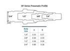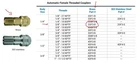 Dixon 2DF3-B Brass Automatic Female Thread Quick Coupler 3/8 FNPT x 1/4 Body 2DF3-B - DF-Series Pneumatic Automatic Female Threaded Coupler Material: Brass Maximum OD: 0.99" (25.1 mm) Thread: NPTF Body Size: 1/4" Temperature Range: -40°F to 250°F (-40°C to 121°C) Thread Size: 3/8" Length: 2.38" (60.5 mm) Hex: 11/16" Compatibility & Interchange Data Foster 3, 4, 5 and 6 Series Parker 30 - Series Automatic Interchange Hansen 3000, 4000, 5000 and 6000 Construction Machined components are manufactured using solid bar stock. Stainless steel balls, retaining rings and springs maximize corrosion resistance and extend service life. Nitrile (Nitrile Rubber) seals are standard Steel componentry is plated using ROHS Compliant Trivalent Chrome. Steel tubular valve How It Works To disconnect, begin by holding the hose on the nipple side with three of your fingers, leaving your thumb and index finger free. Grab the sleeve with your thumb and index finger and begin to pull the sleeve towards the palm of your hand. After pulling the sleeve, the nipple will move out of the coupler slightly. Continue to hold the hose and coupler sleeve until all air is fully exhausted. After the line is fully exhausted, you are able to safely separate the nipple from the coupler. Rated pressure for connected Brass Coupler & Brass Plug: 300 PSI (20 bar) Maximum Working and 16,000 PSI (1,100 bar) Burst Rated pressure for connected Brass Coupler & Steel Plug: 500 PSI (35 bar) Maximum Working and 16,000 PSI (1,100 bar) Burst