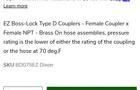 BD075EZ Dixon Valve 3/4" Brass EZ Boss-Lock Type D Coupler. 3/4" npt female to 1" Dixon type D coupler. See pictures for actual parts and dimensions. Local pickup in Utah is accepted by seller. See pictures to see actual part available. Free Shipping New, unused as shown in the photographs. Message me with any questions.