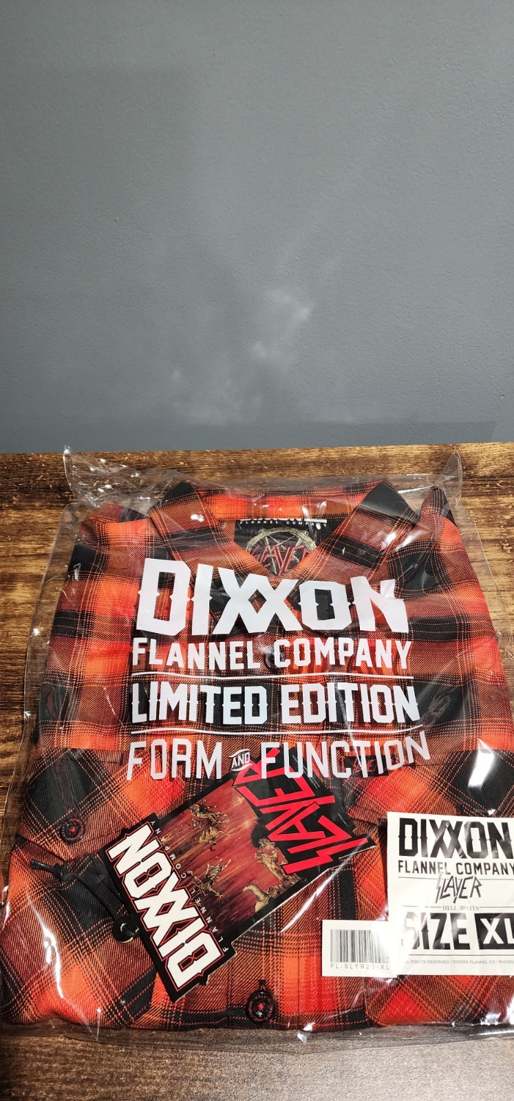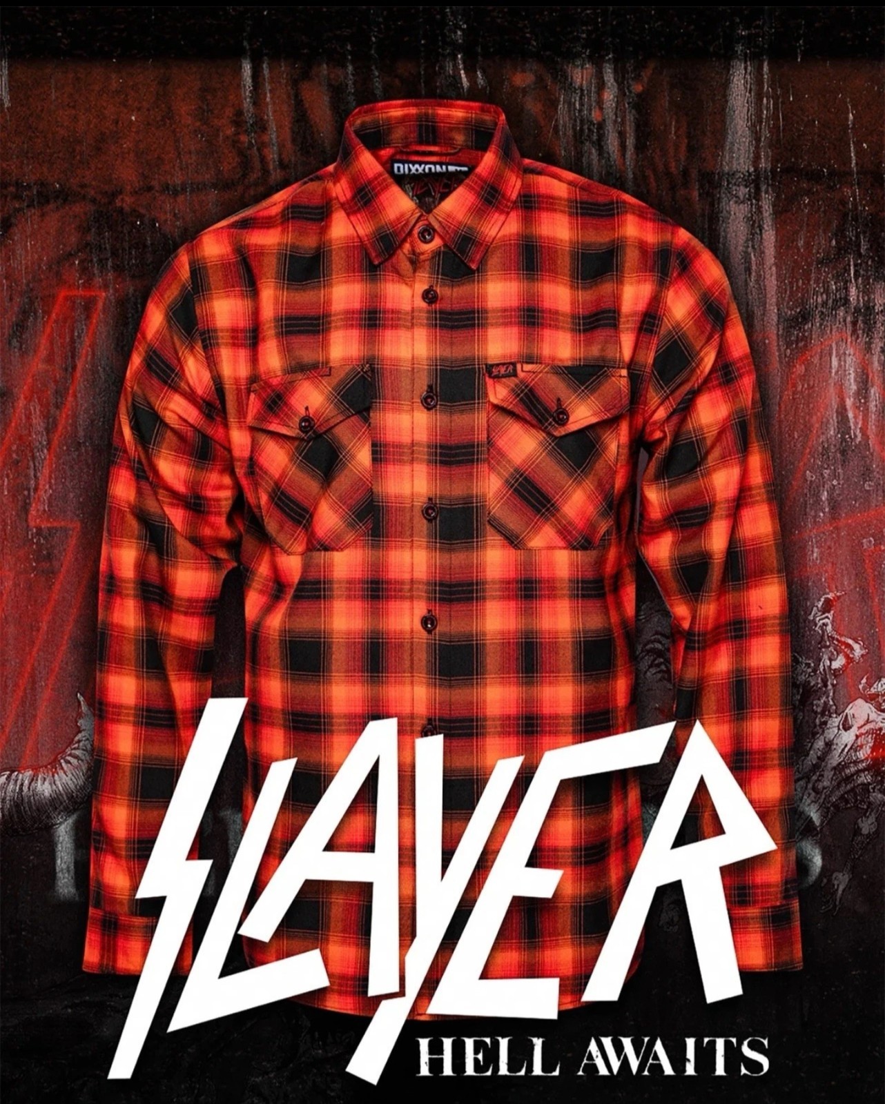Dixxon Flannel company Slayer Hell Awaits Flannel. This item is brand new in the bag. This is a limited edition Flannel that is sold out. Item is sold as seen in pictures