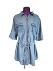 Dizzy Lizzy Blue Chambray Denim Shirt Dress Size 2X Women's Plus Q73 In excellent condition Dizzy Lizzy Blue Chambray Denim Shirt Dress Size 2X Women's Plus. Features lightweight blue denim chambray fabric, button front shirt dress, spread collar, 2 chest pockets with flap closure, tie sash at waist, rounded hem line, short sleeve with roll tabs, falls at thighs, classic casual style. Measurements laying flat chest 23" length 36" arm inseam 6.5" Fabric 100% cotton This is a pre-owned item that may show signs of wear. In excellent condition, no flaws.