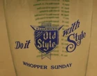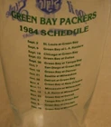 One vintage 1984 promotional Old Style Whopper Sunday Green Bay Packers large glass cup Do it with style Whopper Sunday text with Heileman's Old Style logo and Green Bay Packers 1984 schedule printed on opposite side Measures about 6 7/8" tall, about 3 7/8" wide at rim and about 2 3/4" wide at base (see measurement photos for reference)