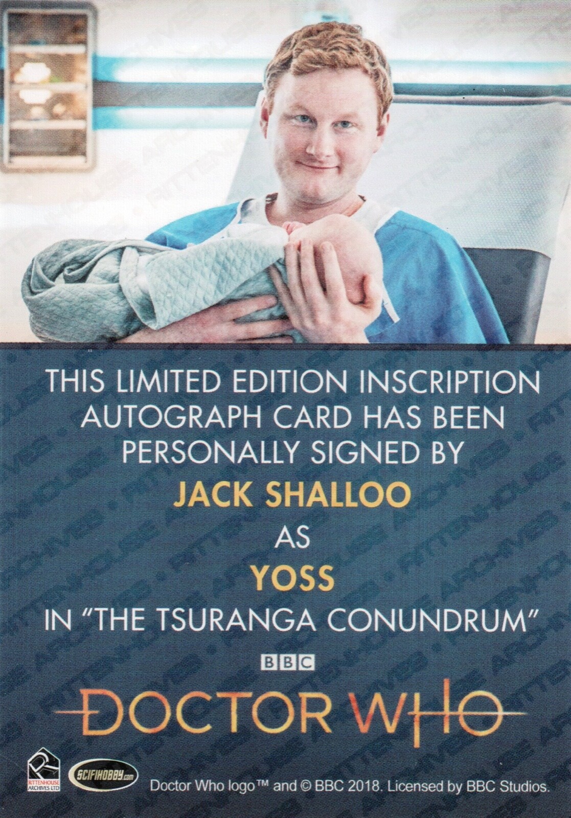 DOCTOR WHO - SERIES 11 & 12 (RITTENHOUSE) Jack Shalloo (Yoss) Inscription Autograph Card The card in the photo is of the actual card you will receive unless otherwise stated. Cards are in Mint / Near Mint Condition. All cards will be shipped in protective packaging. UK Shipping - Free Postage International Shipping - Costs charged via Global Shipping Program For combined purchases please checkout all items at the same time
