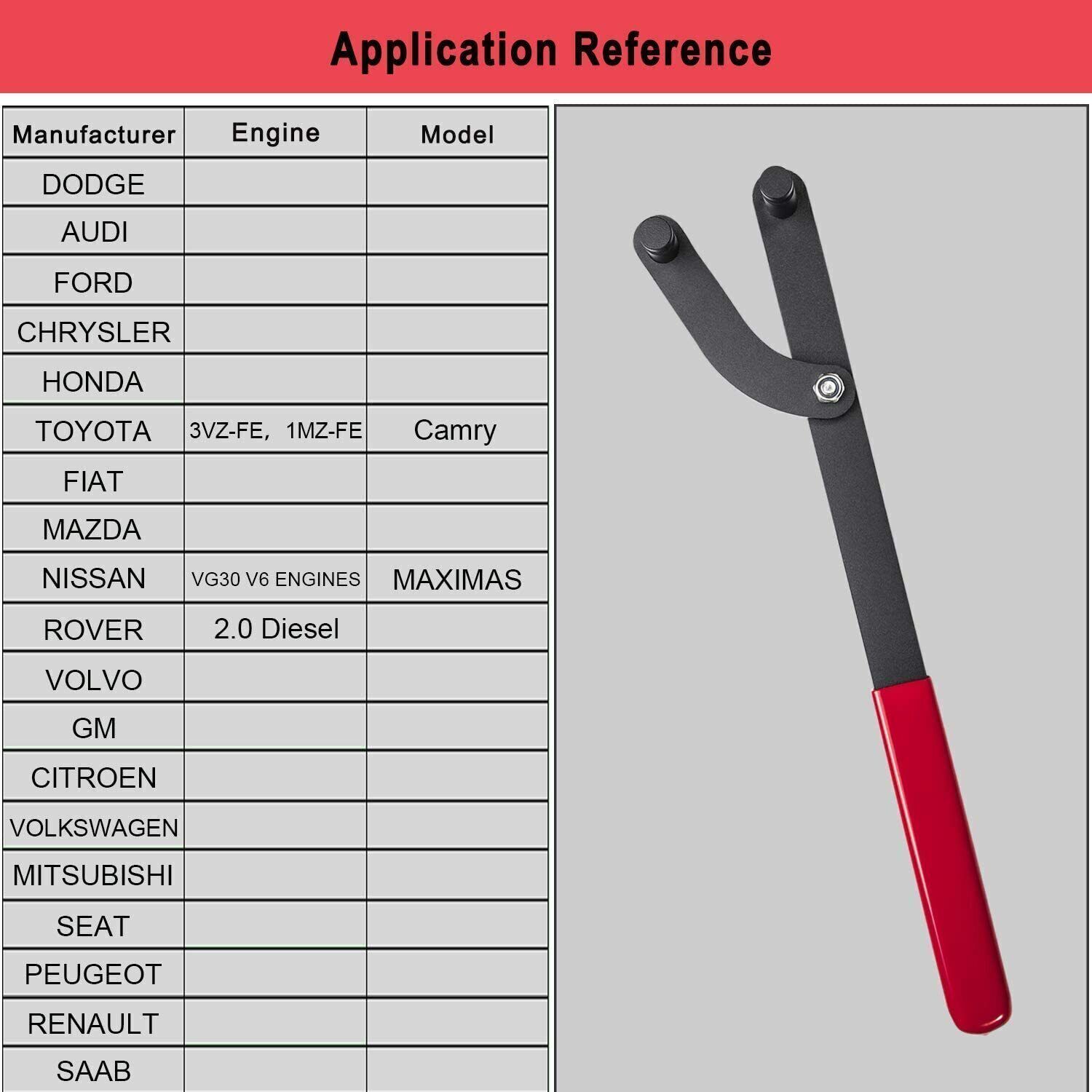 Fitment Reference: Audi, Citroen, Dodge, Ford, Fiat, Peugeot, Honda, Mazda, Mitsubishi, Renault, Rover (2.0 Diesel), Saab, Seat, Volkswagen, Volvo, Toyota- Camry (3 VZ-FE, 10 MZ-FE), Maximas (Va 30 VG Engines). Features: This wrench is designed with grooved pins which are designed hold the camshaft pulley stationary while loosening and tightening the center shaft bolt. Nice long arm with non-slip handle is great for leverage and no harm to your hand ! Super flexibility for all sizes of sprockets ! Pivoting design will fit any style gears. Time & Energy Saver: With this tool, no more jamming screw drivers through cogs to hold camshaft sprockets or or camshaft gears in place. Package includes: 1pcs Cam Pulley Holding Tool