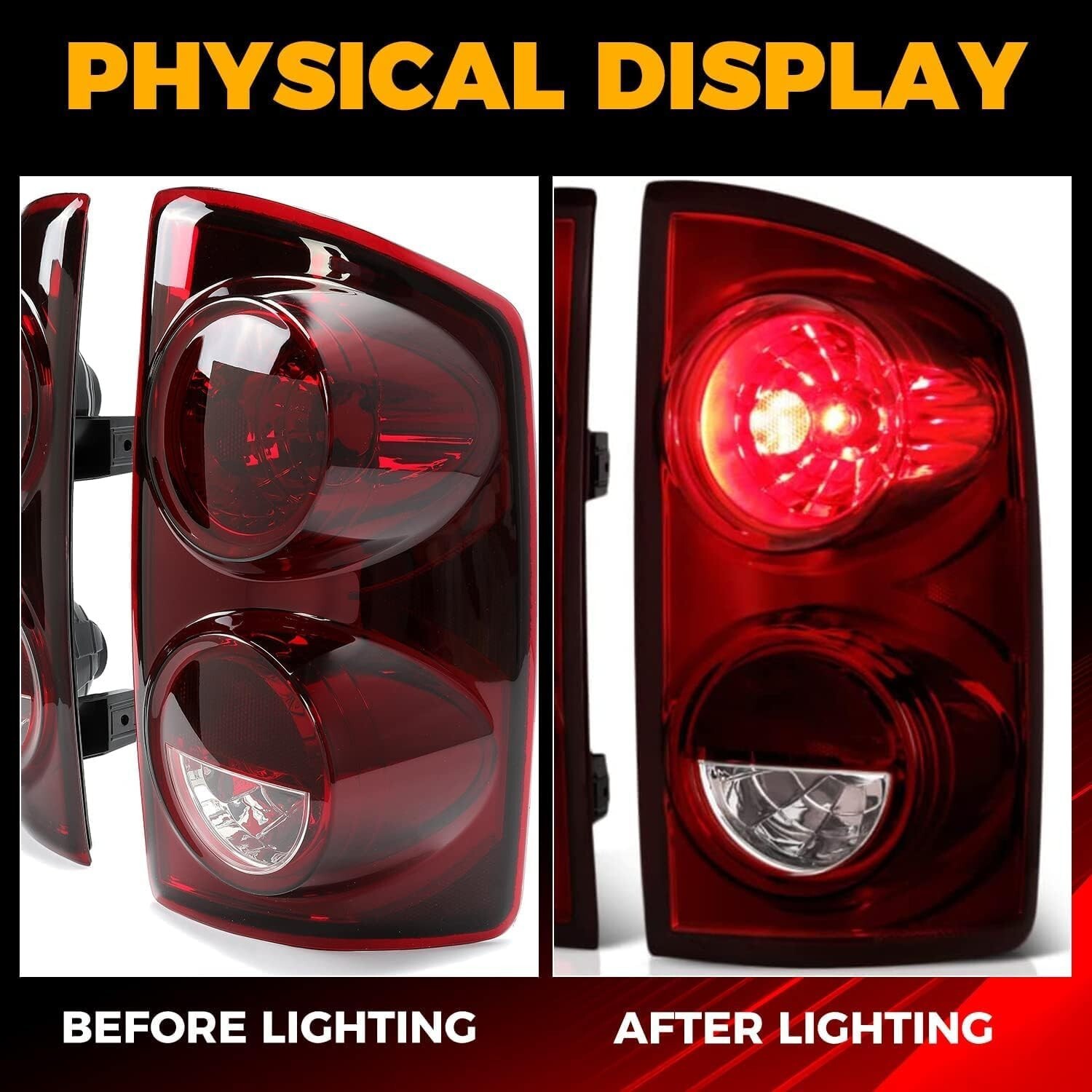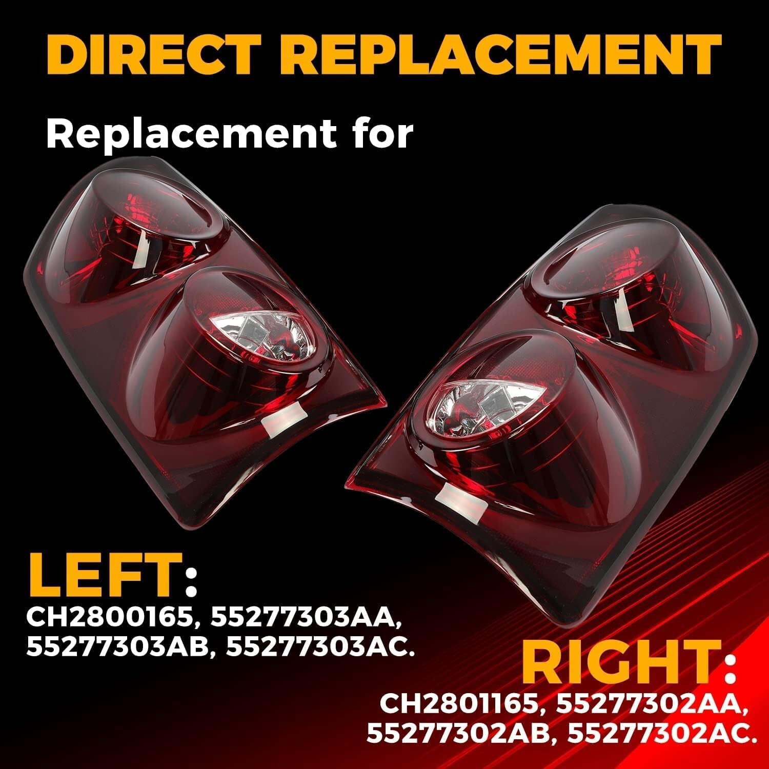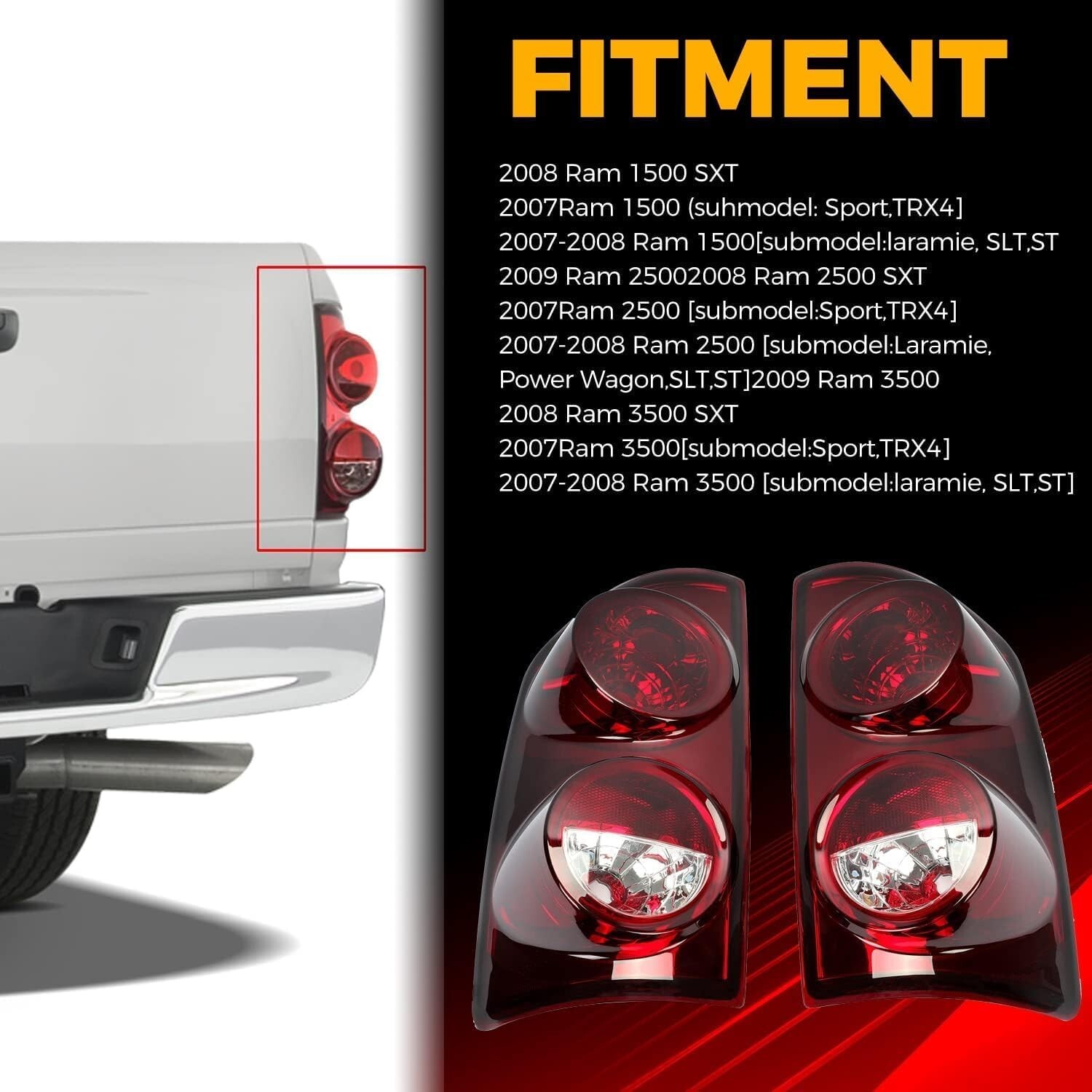 About this item Rear Left/Right Taillight compatible with 2007-2008 Dodge Ram 1500, 2007-2009 Dodge Ram 2500/3500 Replacement for CH2800165,CH2801165, 55277303AA, 55277302AA, 55277303AB, 55277302AB, 55277303AC, 55277302AC. Designed to be an exact replacement for your tail lamps with no vehicle modifications required Color: Smoke Red Lens+Chrome Housing. The lens is made of automotive grade plastic for high light transmittance, fading resistance, tough and durable enough for long-lasting performance. Designed for good fit and easy installation. Professional assembly is highly recommended Package included: 1 Pair taillight, Please note that light bulbs and wiring harness are not included. Instruction and hardware are not included.