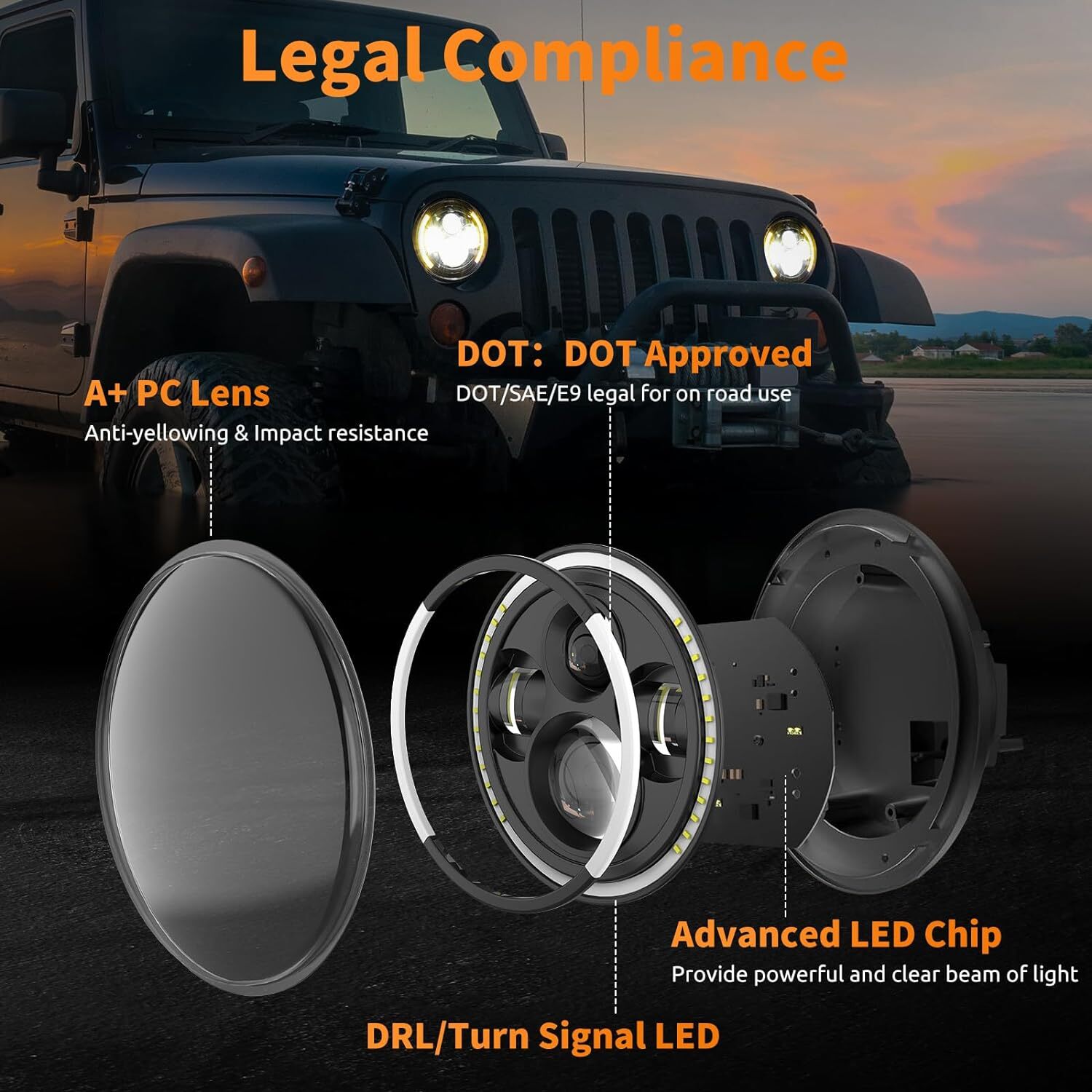 Specification: Material: Durable ABS and LED Light Beam:High Beam+Low Beam+Halo DRL Voltage: DC12V Life Span: 50000 hours Dimension: (7 inches) 7.01" x 7.01" x 3.07"(178mm x 178mm x 78mm) Power: 140W/PCS 280W/PAIR Features: 7 inches LED Headlights is Multi- function - Halo can be White or Amber. Amber is for turn signal; white is for DRL. Faster on/off response time, striking warning effect to enhance driving safety. Weatherproof, low power consumption, long lasting. Simple installation - Plug & Play. Product include: 2 x 7 Inch Round LED Headlights Halo DRL Angle eyes Turn Signal Light
