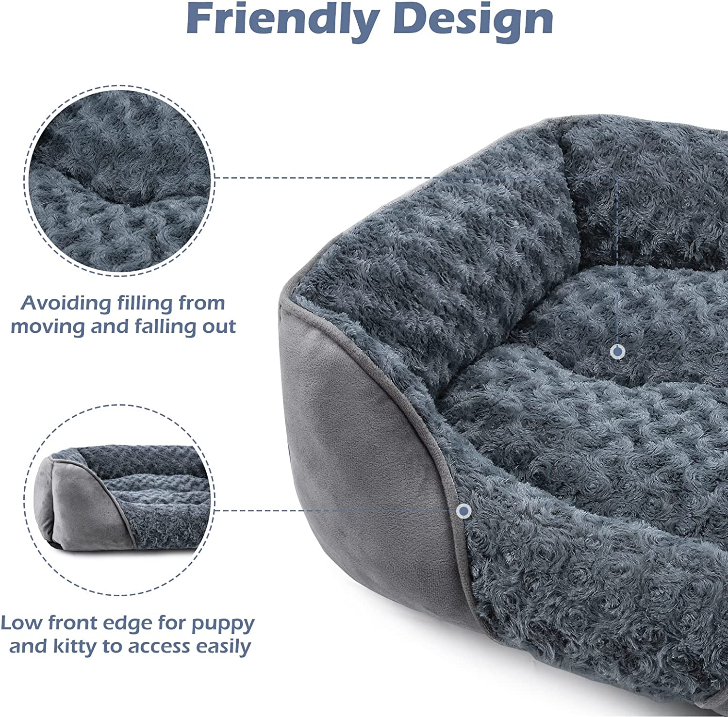 🐶Comfort & Security Edge: Raised four walls and pillow-like rectangular dog bed provide good support and cushion for the dog's head and neck, the super-soft filling offers joint and muscle pain relief. and allowing your puppy to have a comfortable and restful sleep. Low leading-edge design is easy access for small and old dogs. 🐶Ultra Soft Material: Pet bed is covered in rose swirl short faux fur and cozy suede fabric, which is soft and warm during the winter and effectively retains your pet’s body heat. the bottom and sides stuffed with thickened and eco-friendly pp cotton to create a breathable and comfortable sleeping environment, which keep your dog away from the floor, the surface plush is warm and cozy, In no time, your pet will be snoozing away in the elevated comfort of this dog bed. 🐶Size Details: Small dog bed for Small dogs up to 15lbs, the outer size is 20"x19"x6"; Medium dog bed for Medium dogs up to 30lbs, the outer size is 25"x21"x8"; Large dog bed for Large dogs up to 40lbs, the outer size is 30"x24"x9"; X-Large dog bed for Jumbo dogs up to 60lbs, the outer size is 35"x25"x9"; XXL dog bed for Large dogs up to 80lbs, the outer size is 42"x30"x10"; Please be sure to confirm the size. 🐶Washable Dog Bed: Durable pet bed machine washable as a whole. Gentle cycle and thoroughly dried in dryer directly after washing and do not Air dry. Please use your hands to pat, shake the dog bed and wait for 1-2 days to wait it back to fluffy status before using. 🐶Anti-Slip Bottom: This calming dog bed is equipped with non-slip bottom to keep the pet bed in position and keep your pets safe. Product Description INVENHO Ultra Soft Dog Deds for Your Lovely Dogs and Cats INVENHO Pet bed designed with perfect shape for puppies and senior pets to curl up in, and the raised bolster gives them a place to rest their heads and neck. One side features rose swirl faux fur that is soft and warm during the winter. The other side features smooth suede fabric that is cooler during warmer weather. Your pets will love the feel of the soft sleeping area that’s stuffed with fluffy fiber filling for extra comfort. 1. Pet bed is covered in rose swirl short faux fur, which is soft and warm during the winter and effectively retains your pet’s body heat. 2. Exterior is ultra-soft suede breathable fabric feels like mommy's fur and attracts your dogs to lie on the bed. 3. Non-slip Bottom: Rubber non-slip bottom can help the bed to be fixed in one position without moving easily. Allowing your pet to play and rest in a calming dog bed firmly and safely. 4. The inner fixed designed for avoiding filling from moving and falling out. 5. Low leading-edge design is for easy access for small and old dogs. 6. Durable dog bed machine washable as a whole, Pet bed retains its original shape even after many cycles of machine washing. Tips: Please open the vacuum-packed dog bed and use both hands to pat the four sides of the dog bed. Put the suede side on the outside, the velvet side on the inside. It needs to be left in place for two days and let the bed restore the original sofa shape!