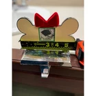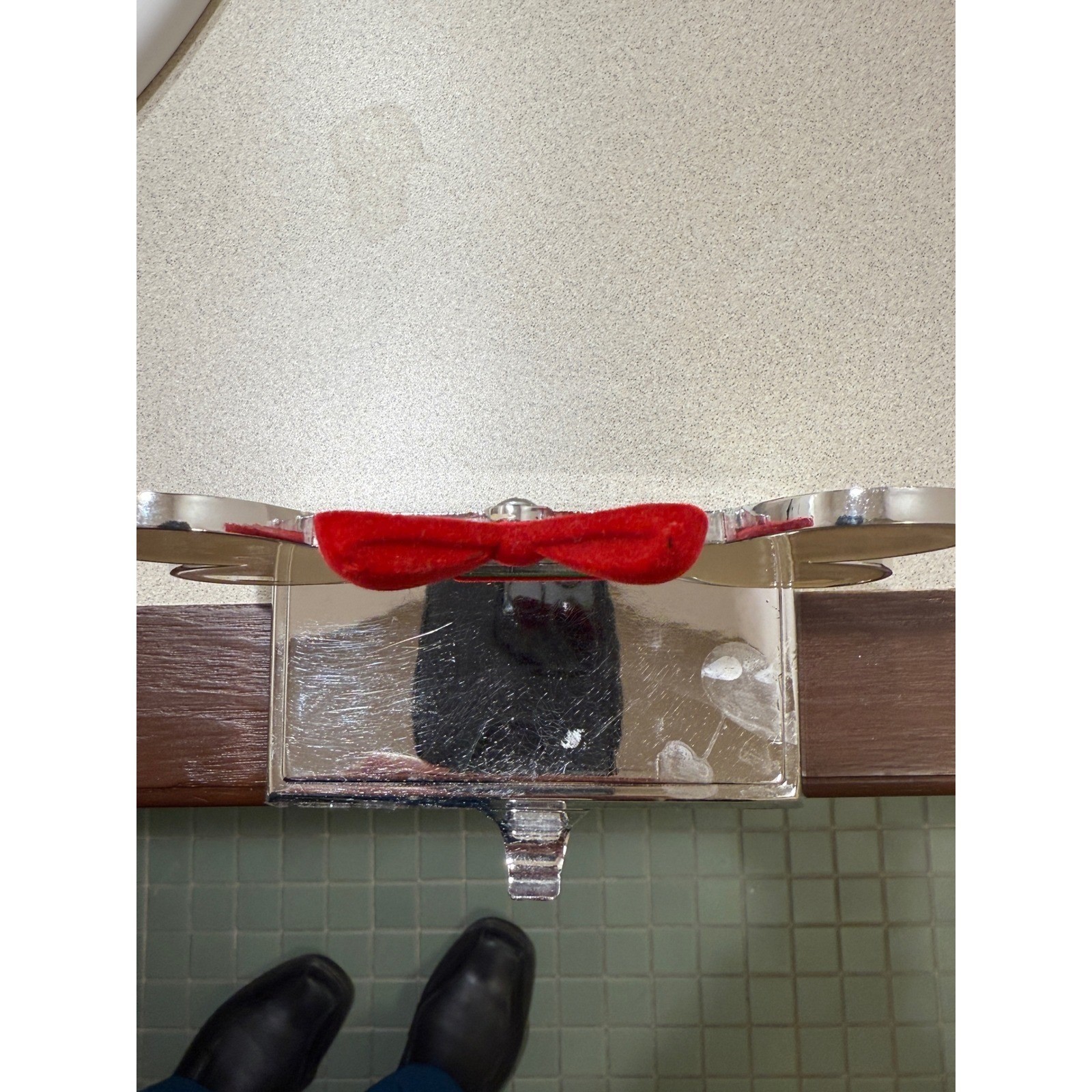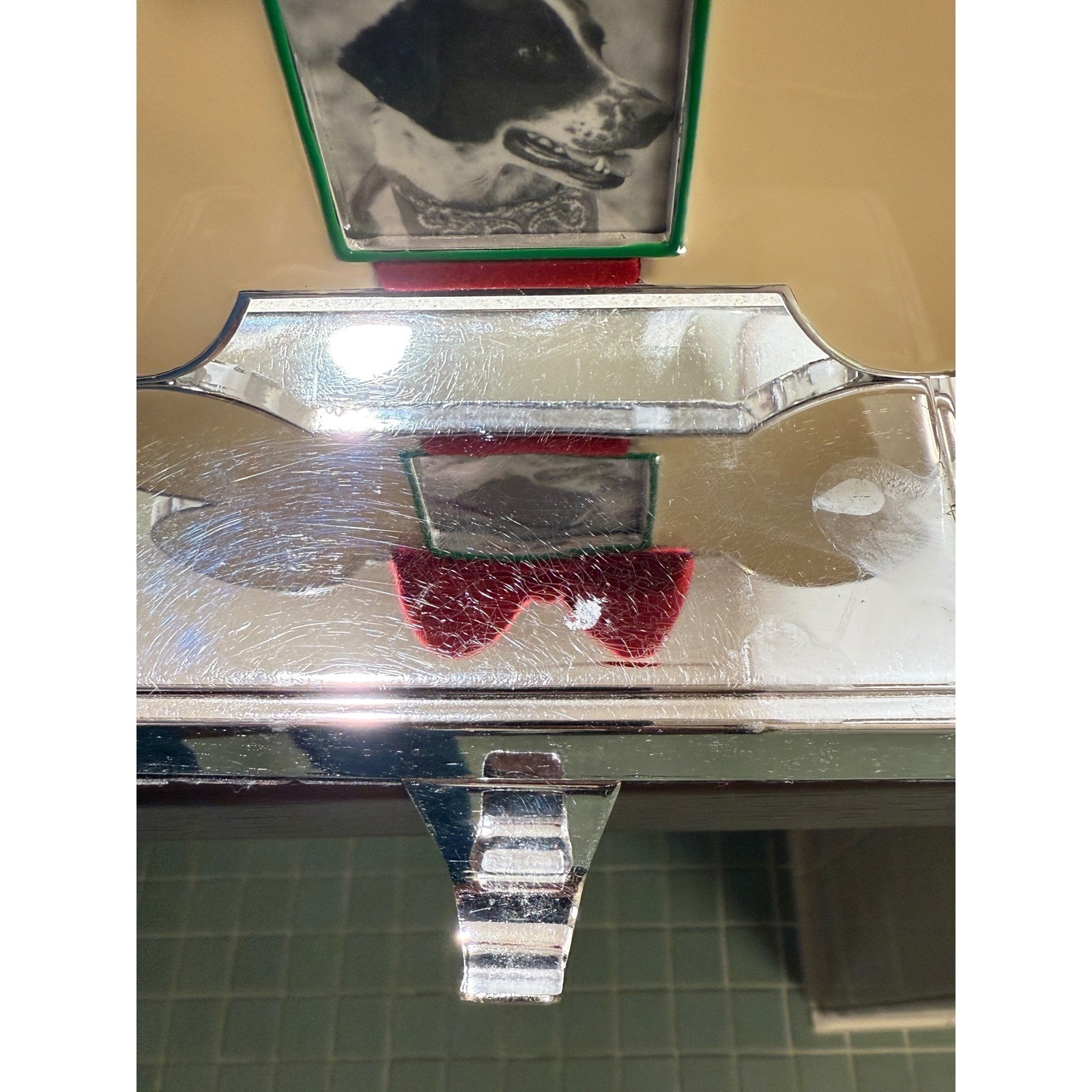 Dog bone Christmas stocking holder features a polished silver-tone base with a cream-colored bone-shaped topper. A festive red velvet bow sits atop a small square photo frame, allowing for a personalized touch with a picture of a beloved pet. The weighted design ensures stability on a mantel or shelf, while the underside is felt-lined to protect surfaces from scratches. Measurements: • Width: 5" • Depth: 3.75" • Height: 5"