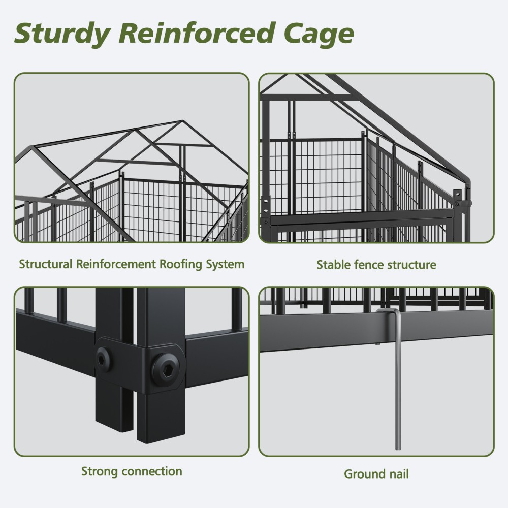Key Product Specifications Color: Sleek Black Material: High-Quality Iron (Durable & Rust-Resistant) Assembled Dimensions: 7.94'L x 4.13'W x 5.95'H (95.28" L x 50.00" W x 71.65" H) Door Dimensions: 1.8'W x 4.02'H (Easy In & Out for Pets) Product Weight: 83.30 LBS Package Dimensions: 54.72" L x 26.38" W x 7.68" H Package Weight: 88.85 LBS Assembly Time: Approximately 45 Minutes (All Hardware Included) Package Quantity: 1 Box (All Modules Included) Why Choose Our Outdoor Dog Kennel? ✅ Spacious Living Space for Happy Pets Measuring 7.94’L x 4.13’W x 5.95’H, this oversized pet enclosure offers plenty of room for your furry friends to move around, play, and rest freely. The open design ensures excellent ventilation and visibility, reducing anxiety and creating a comfortable living environment. ✅ Reinforced & Secure Structure Crafted from premium iron, this dog cage features a sturdy frame with multiple load-bearing columns for enhanced stability—no wobbling even in windy conditions! The double door lock design provides double security, preventing your pets from escaping unexpectedly and keeping unwanted animals out. ✅ Convenient Feeding Design Equipped with 2 rotating feeders that can be adjusted up and down by 3.9 inches. This thoughtful design allows you to feed your pets easily without opening the main door, saving time and hassle. Perfect for both food and water placement. ✅ All-Weather Protection The advanced roof cover is windproof, UV-resistant, and waterproof, effectively shielding your pets from rain, strong winds, and harsh sunlight. Keep your beloved pets dry, cool, and comfortable in any weather condition—summer, winter, rain, or shine! ✅ Multi-Functional Use Not just for dogs! This versatile enclosure is ideal for raising chickens, ducks, geese, rabbits, and other small to medium-sized animals. Great for outdoor use in your backyard, garden, patio, or farm. ✅ Easy Assembly in 45 Minutes No professional tools needed! All modules can be easily assembled with the included connectors and screws. The door can be installed in any position to fit your specific needs—flexible and user-friendly. Premium After-Sales Guarantee 1 YEAR QUALITY WARRANTY & 30-DAY FREE RETURN/EXCHANGE! We stand behind the quality of our products. If you encounter any issues with the dog kennel within 1 year of purchase, we offer free replacement parts or repair services. Not satisfied? Enjoy a 30-day free return or exchange policy—no questions asked. Shop with confidence! Package Includes 1 x Large Metal Dog Kennel Frame 1 x Weather-Resistant Roof Cover 2 x Adjustable Rotating Feeders All Necessary Connectors & Screws 1 x Detailed Assembly Instruction Manual Invest in a durable, safe, and comfortable home for your pets today! Add to cart now and give your furry friends the outdoor space they deserve.