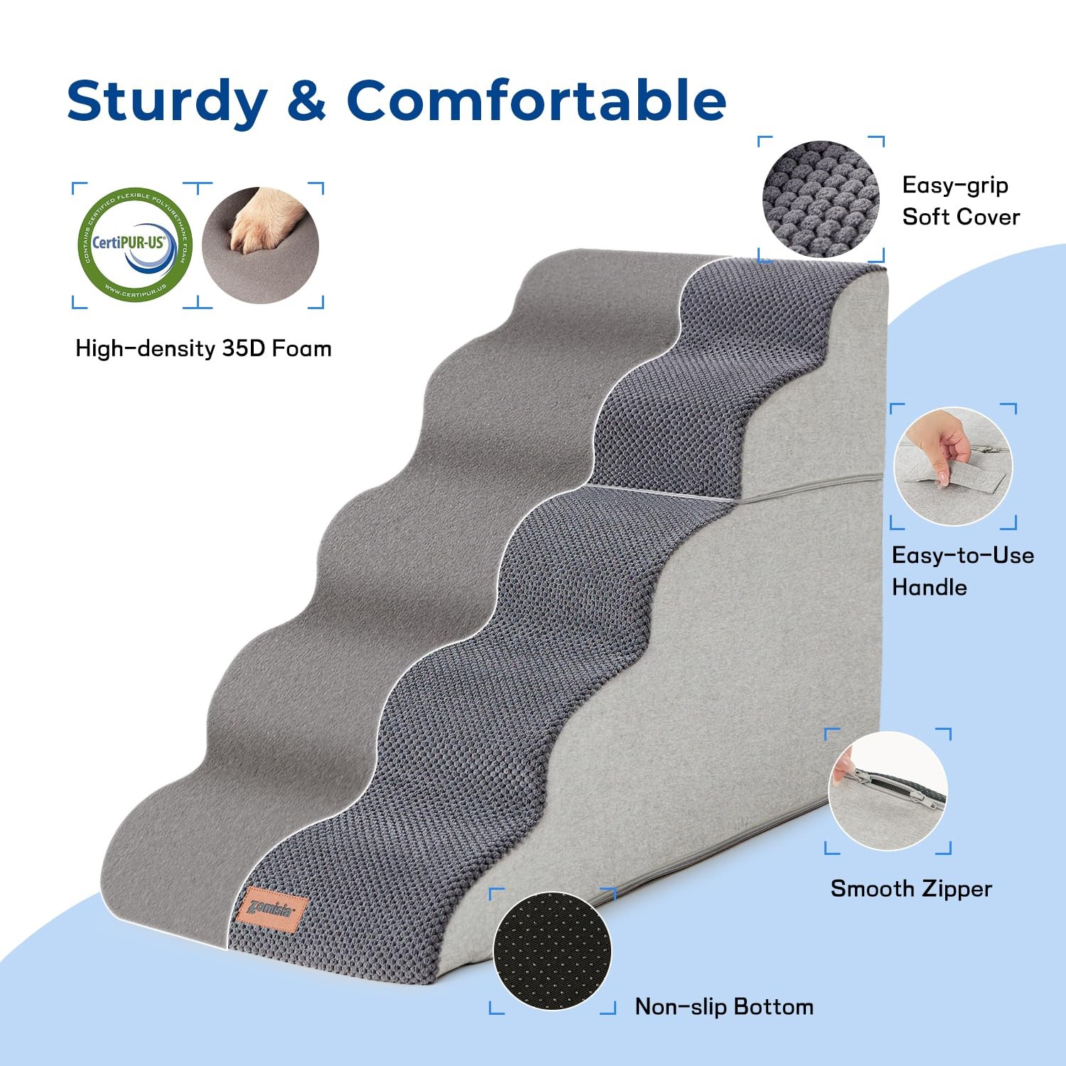 Pet Stairs Grey 5 Step 1 PCS Versatile: This dog stair is suitable for small dogs, elderly dogs, or injured pets, helping them easily access sofas, beds, or vehicles. The split design connects the two parts with a zipper, allowing them to be used together as a 5-step dog stair, or separately as a 3-step stair and a 2-step stair. Multiple Step Sizes: This pet stair comes in 3-step, 4-step, and 5-step options. The 3-step version has a height of 13.5 inches, ideal for small pets to access low sofas or chairs. The 4-step model, with a height of 18 inches, provides easy access to sofas or beds. The 5-step model, with a height of 22.5 inches, allows pets to comfortably reach higher beds or cars. Sturdy and Supportive: This dog stair is made from 35D high-density foam, providing enhanced stability and strong support for pets while walking. The low-angle ramp design prevents joint pressure that jumping might cause. Comfortable and Safe: The outer layer is made of plush fabric, increasing friction between pets' paws and the steps. The bottom of the stairs is non-slip, ensuring stability and giving your pets a sense of security. Easy Assembly and Cleaning: The dog stair is vacuum compressed, requires no assembly, and fully expands in 24-72 hours. The cover is detachable and washable, suitable for hand washing or machine washing. Note that the inner foam cannot be washed with water.