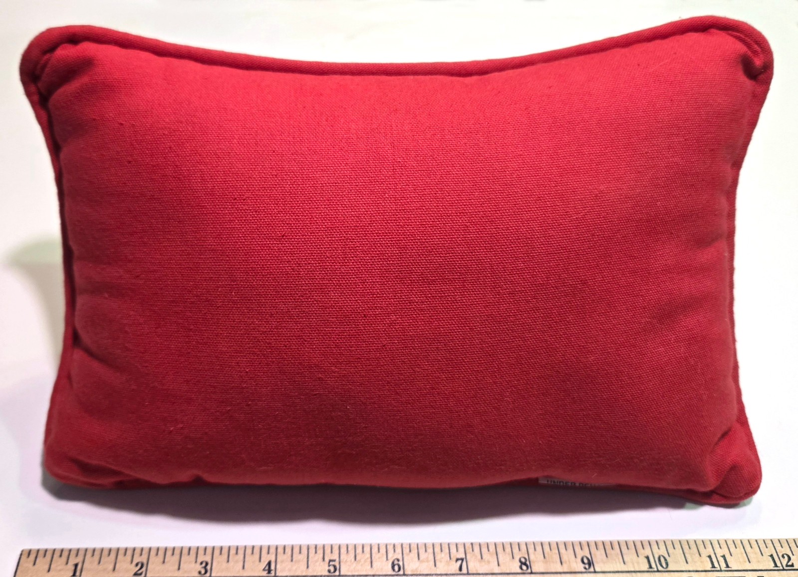 Decor Cross Stick Pillow 12"X8" Cross Stitch Reads: "For a balanced life you need a dog to adore you and a cat to ignore you." With dog/cat footprints in black along a rich red background. (see photos) Back: Matching red cotton fabric with same piping. Great gift for a dog/cat lover. Light use. Display only. Clean. Smoke-Free Home.