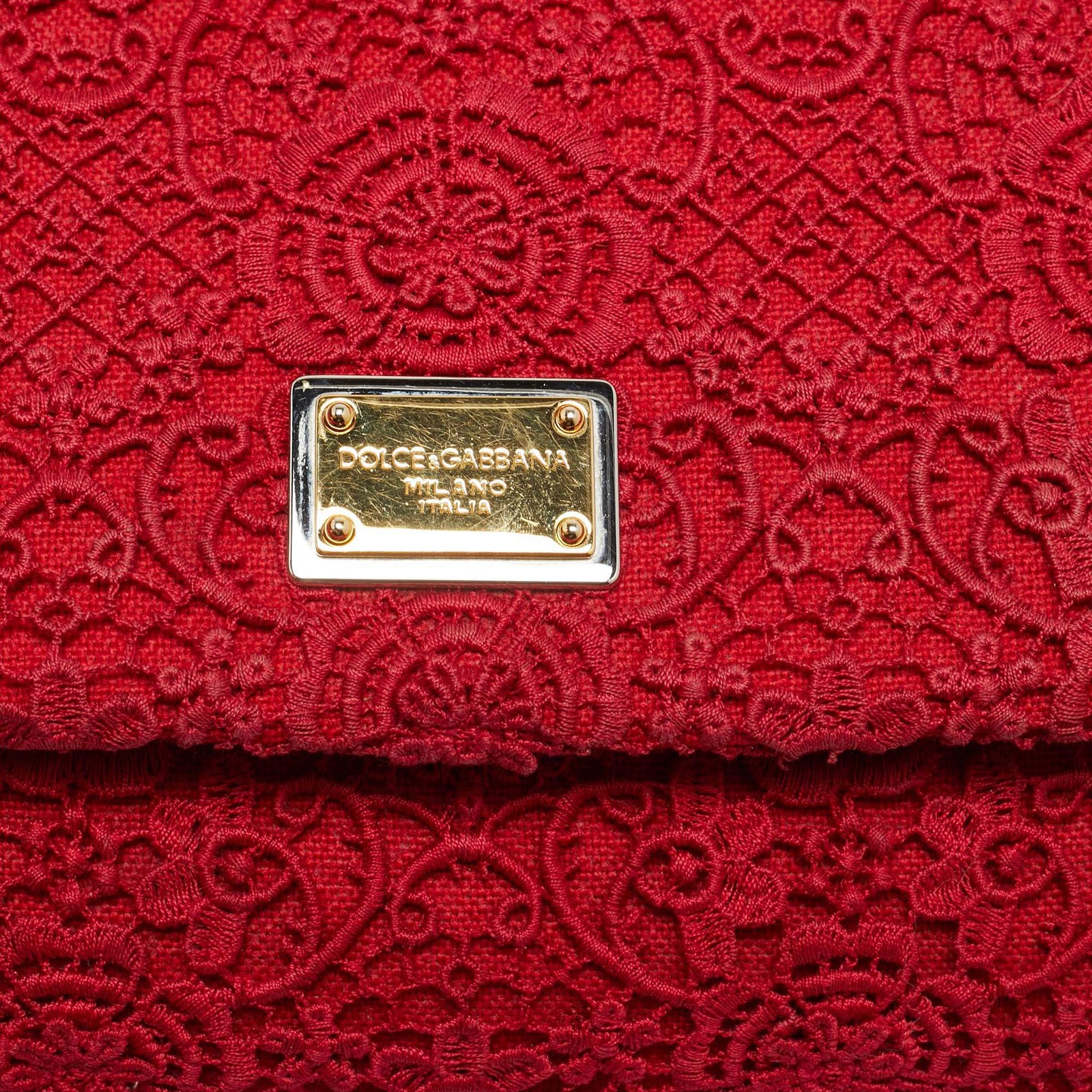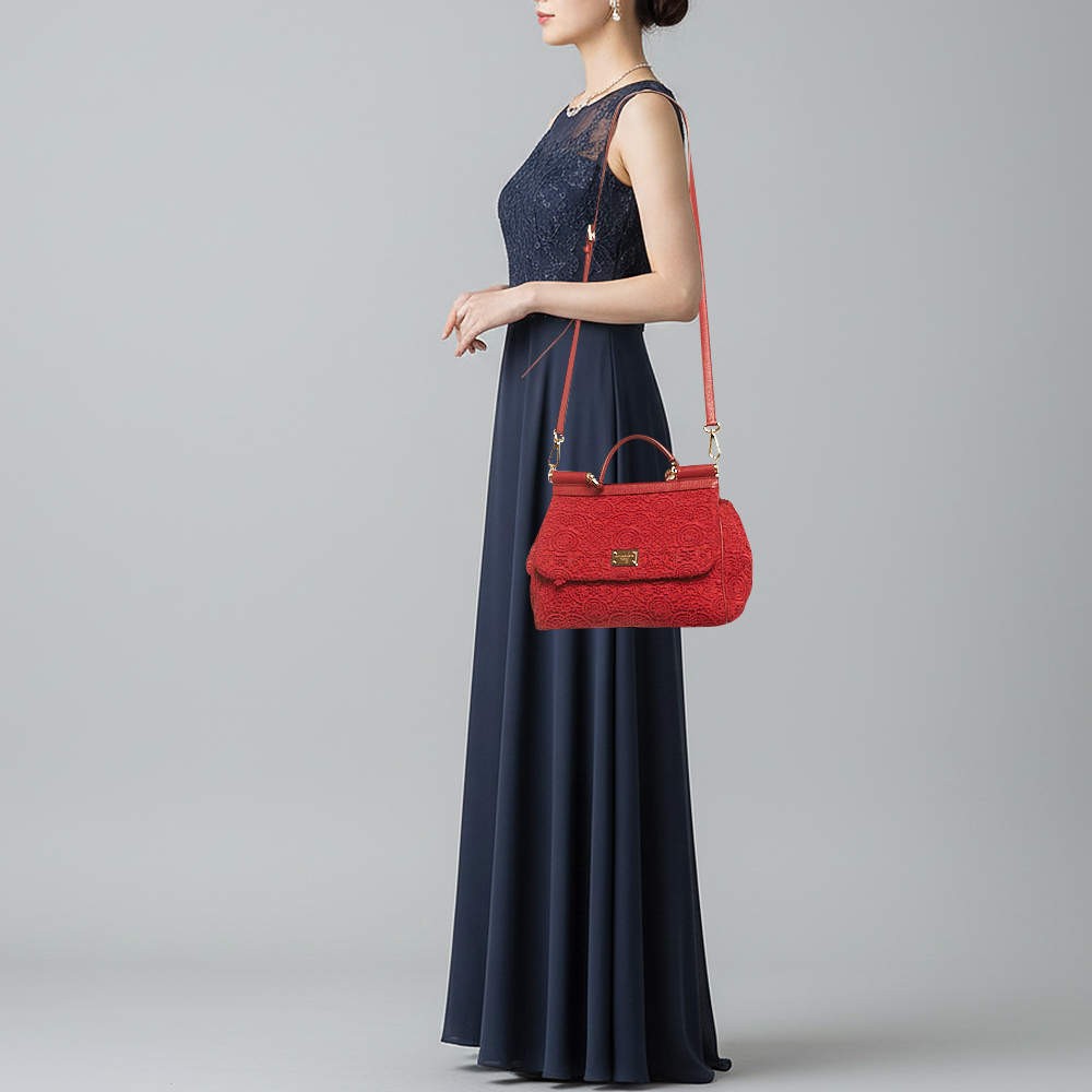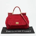 Our eBay Store About Us Contact Us Add to Favorite Sellers Dolce Gabbana Miss Sicily Medium Red Floral Crochet Canvas Top Handle Bag Floral crochet canvas gives this Miss Sicily a textured, handcrafted look in a rich red palette. The structured body is framed by smooth leather trim and finished with a top handle that holds its shape. Medium in size, the bag carries everyday essentials within a design driven by surface detail and colour. Product Details Brand Dolce & Gabbana Includes The Luxury Closet Packaging, Detachable Strap Certified by The Luxury Closet This item has gone through a detailed authentication process overseen by our experts. We offer a lifetime guarantee of authenticity on all our items. How We Check The in-house team of experts at The Luxury Closet is highly trained to verify the authenticity and the condition of the luxury products. They ensure that only 100% authentic items are put on sale.The evaluation process is unique with its own mix of assessment criteria and differs according to the category. Each item is evaluated based on the following combination of hallmarks, hardware, stitching, symmetry, material, craftsmanship, stamping, codes, hologram stickers, and packaging. Our authenticators also check if the items have been modified or amended (e.g., aftermarket diamonds, replaced batteries, repaired bags, etc.) International Buyers Import duties, taxes and charges are not included in the item price. These charges are the buyers responsibility. Please check with your country’s customs office to determine what these additional cost will be prior to buying.