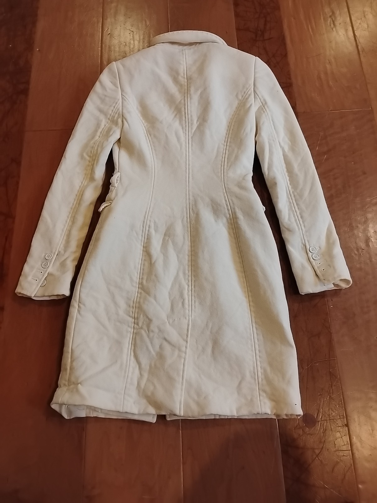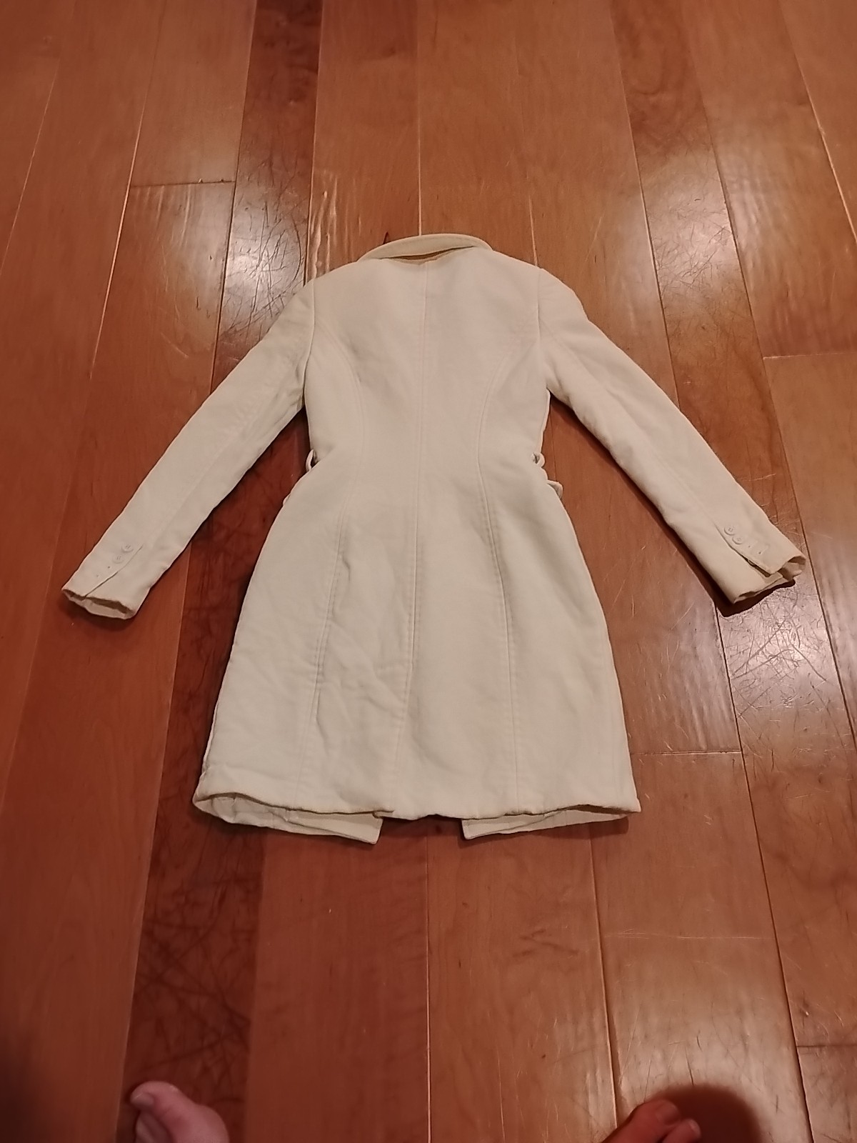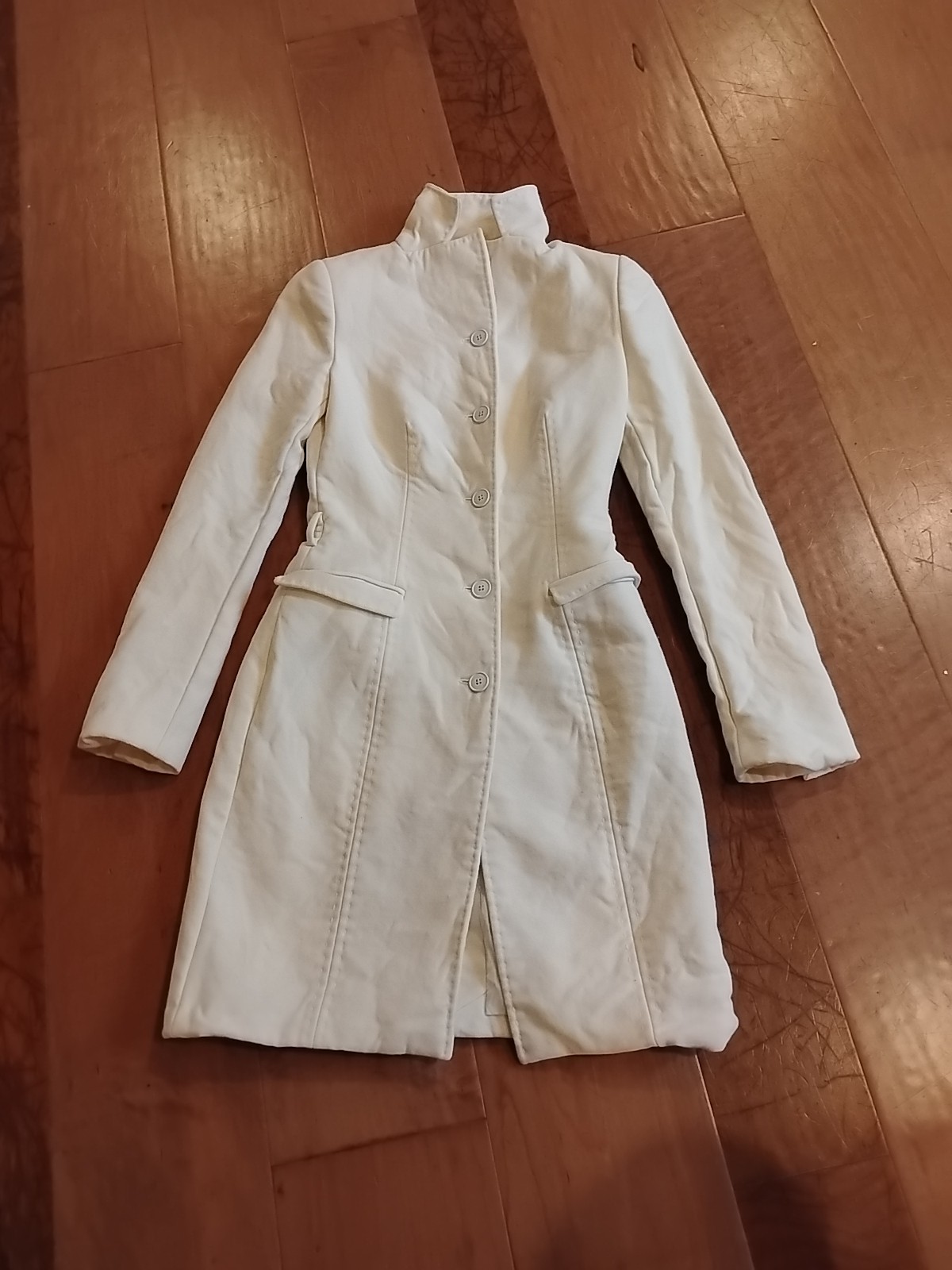 The product is a Dolce & Gabbana women's size 38 coat made of 100% virgin wool in a cream color. This long, solid-colored overcoat features long sleeves and is designed for casual occasions. The coat is of high quality and requires dry cleaning for maintenance. It is a stylish and elegant addition to any winter or fall wardrobe, embodying the brand's luxury and sophistication. Perfect for adding a touch of luxury and comfort to any outfit, this coat is a versatile and timeless piece for any woman's wardrobe.