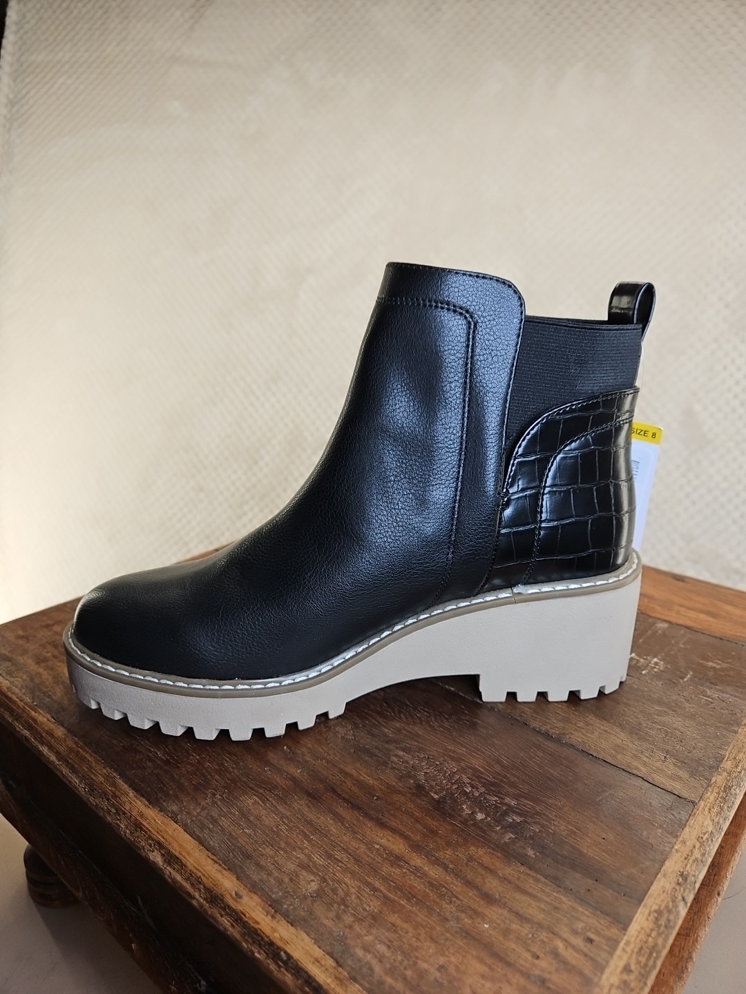 The Dolce Vita Ladies Chelsea Boot in Black Rancher style with a Lug Sole offers comfort and style for various occasions such as travel, casual outings, or business meetings. Featuring an Almond Toe shape, a pull-on closure, and a mid-height wedge heel, these ankle boots are designed for all-day wear. Made with faux leather and a rubber outsole, these boots add a touch of personality to any outfit with their solid black color and Chelsea style. Perfect for fall, winter, and spring seasons, these boots are a versatile addition to any woman's shoe collection....B2197