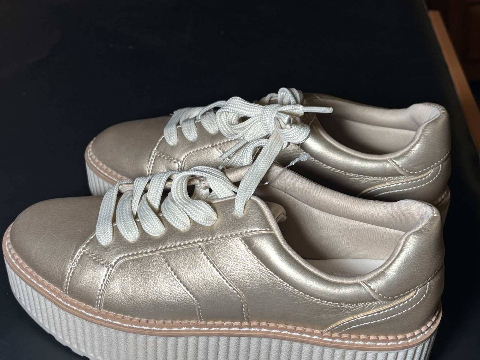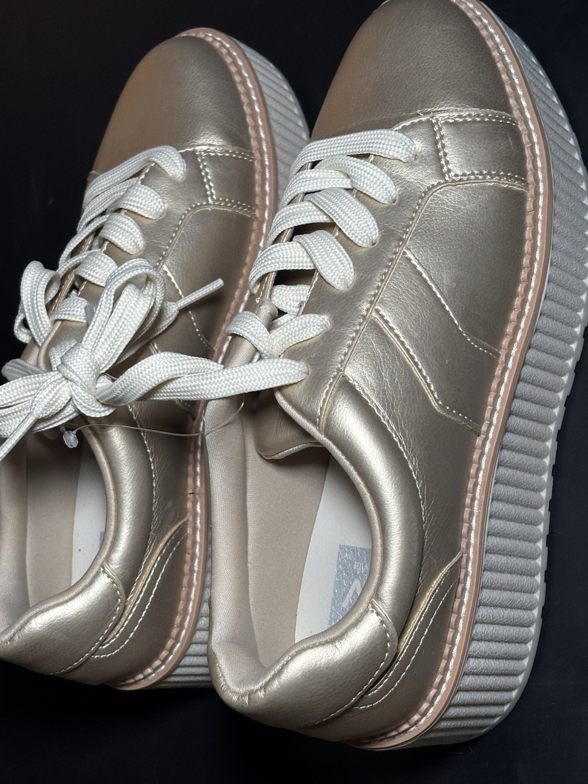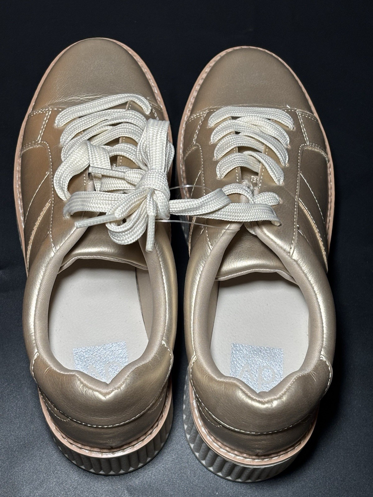 Step out in style with these Dolce Vita metallic lace-up sneakers, perfect for everyday wear with a modern, elevated look. The sleek gold/champagne finish adds a fashion-forward touch while the cushioned interior and rubber sole provide all-day comfort. These sneakers are in very good pre-owned condition with light signs of wear consistent with normal use. No major flaws noted. Clean inside and out. ✨ Great for casual outfits, athleisure, travel, or dressing up denim.